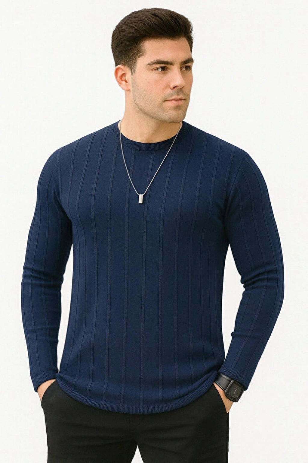 Erkek Slim Fit Dar Kesim Bisiklet Yaka Basic Şeritli Triko Kazak