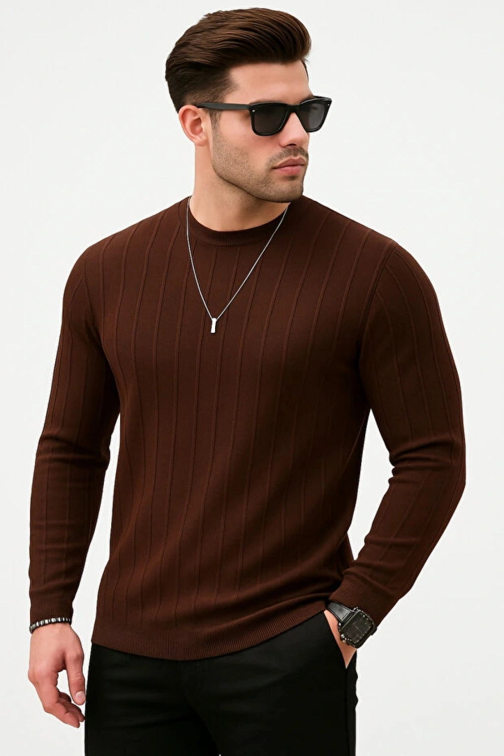 Erkek Slim Fit Dar Kesim Bisiklet Yaka Basic Şeritli Triko Kazak
