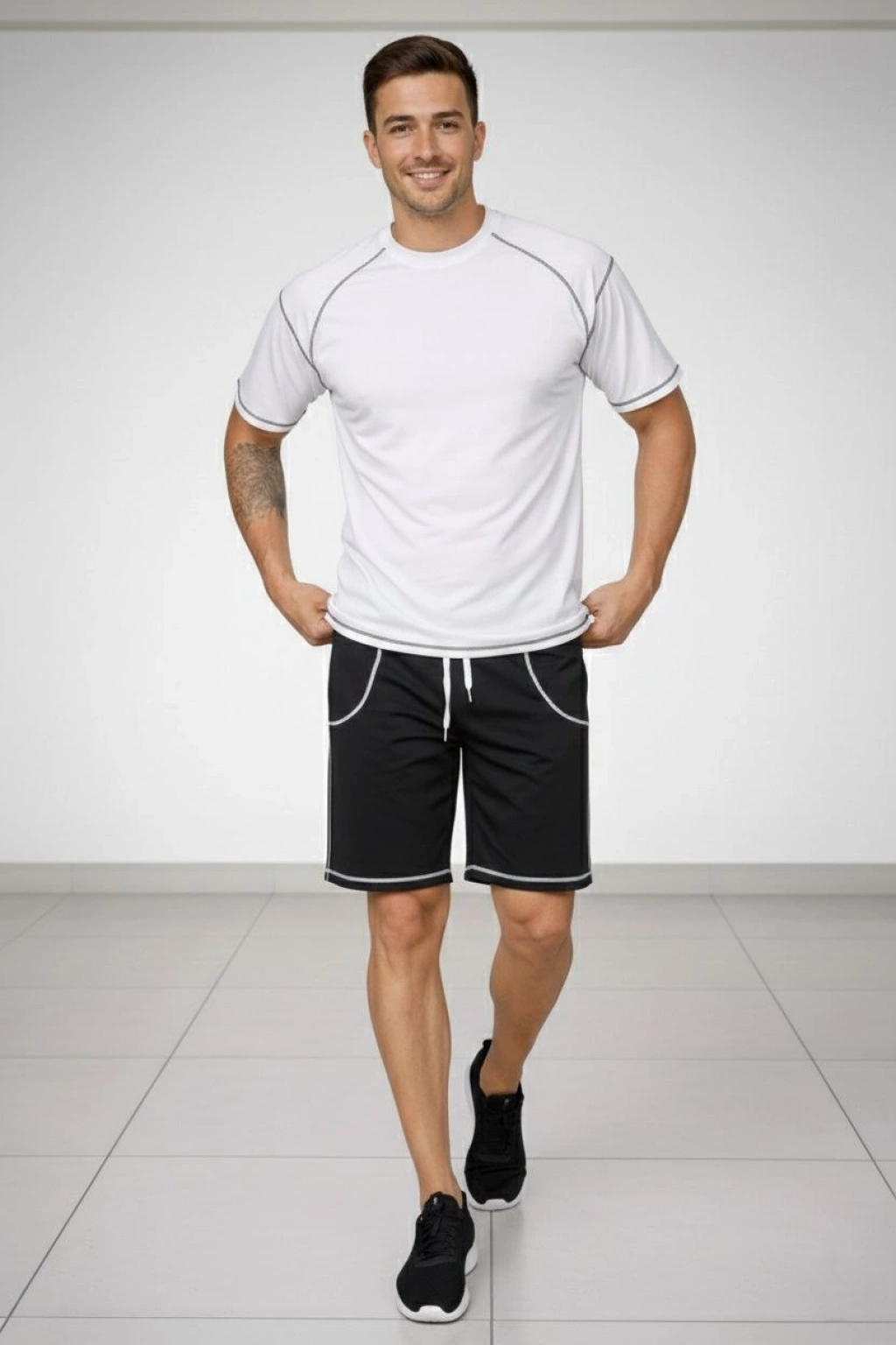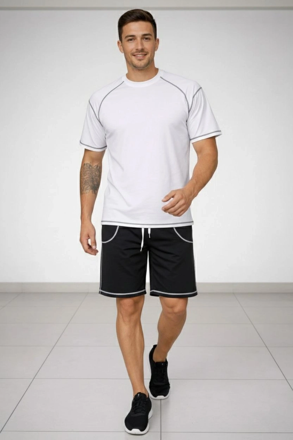 Erkek Spor Tişört Şort Takım Kontrast Dikiş Detaylı Ovarsize rahat kalıp - Beyaz