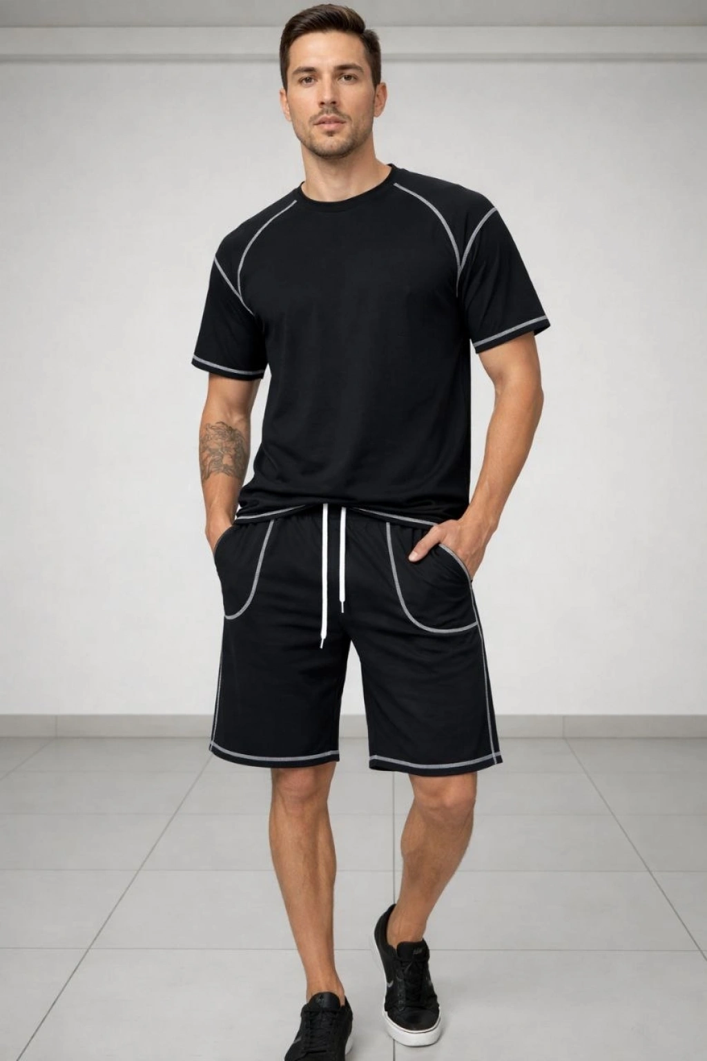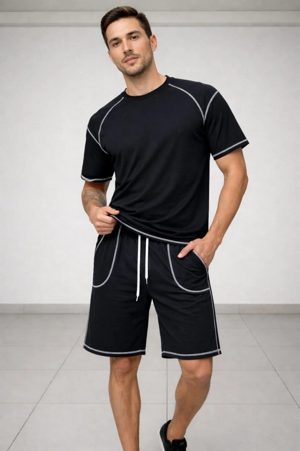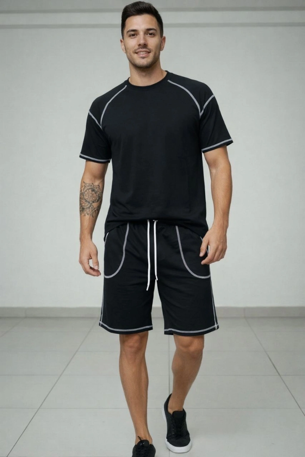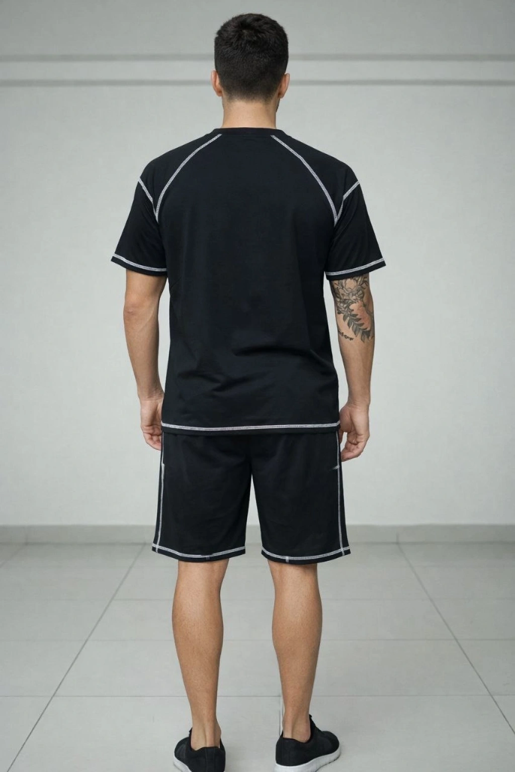 Erkek Spor Tişört Şort Takım Kontrast Dikiş Detaylı Ovarsize rahat kalıp - Siyah