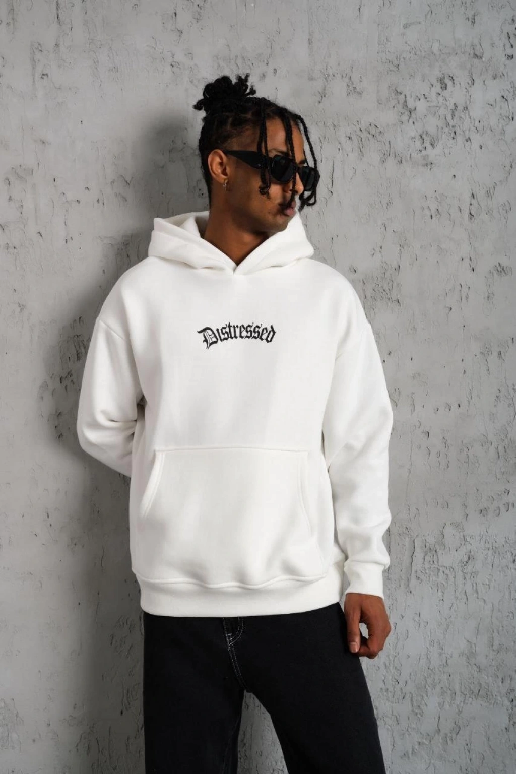 ERKEK OVERSİZE ÜÇ İPLİK KAPÜŞONLU SWEATSHİRT – BEYAZ ÖN BASKILI, KANGURU CEPLİ, RAHAT KALIP, İÇİ PAMUKLU MODEL