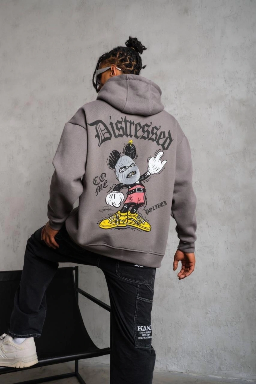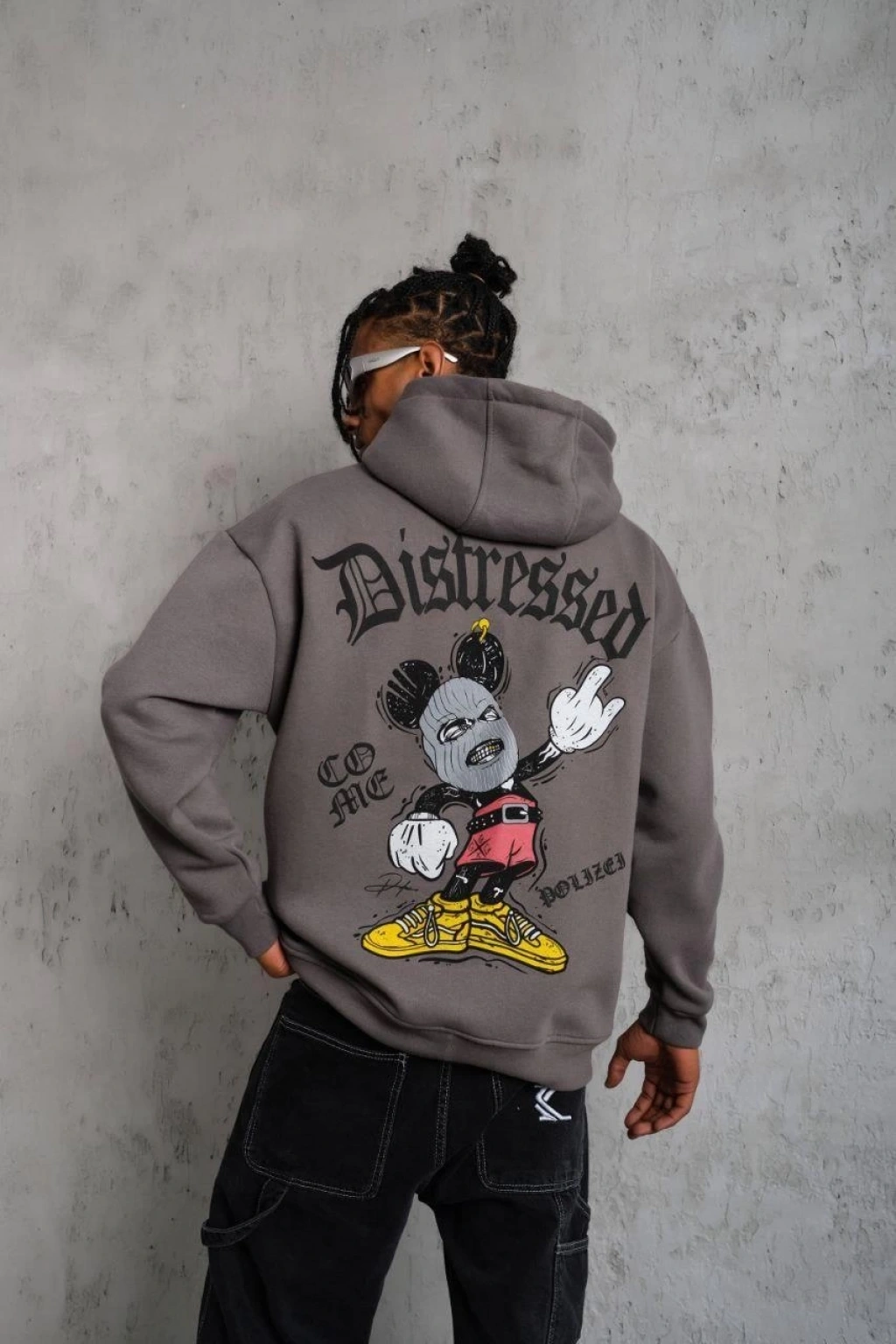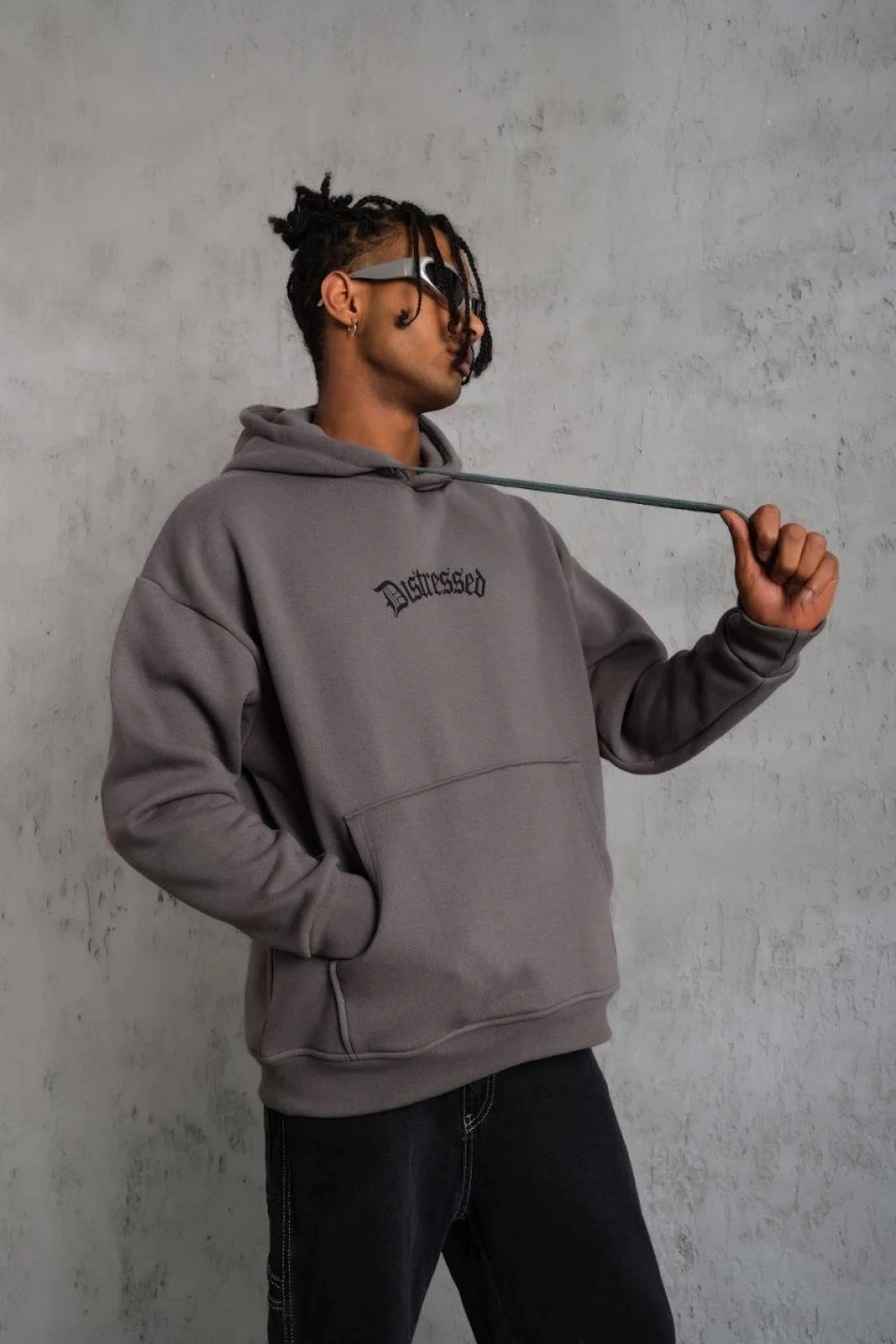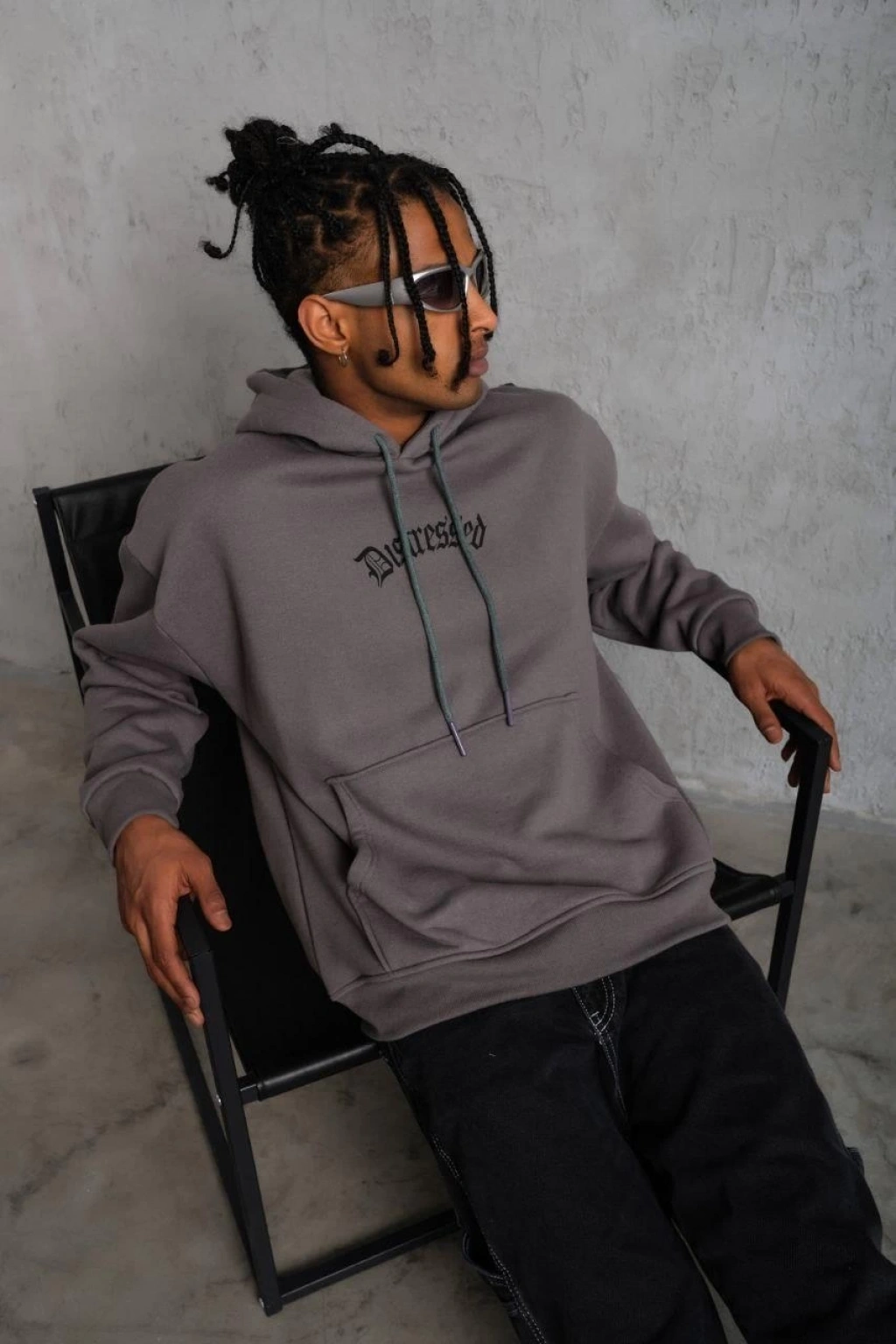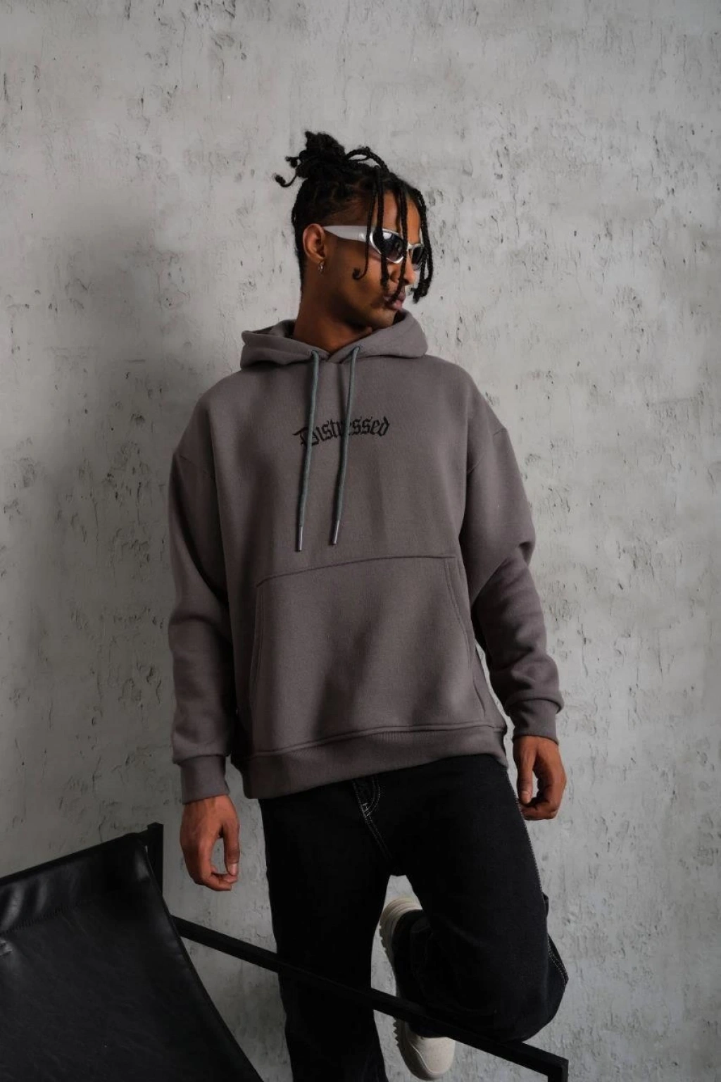 Erkek Nakış İşlemeli Kapşonlu Antrasit Sweatshirt Üç İplik Double Oversize- Füme