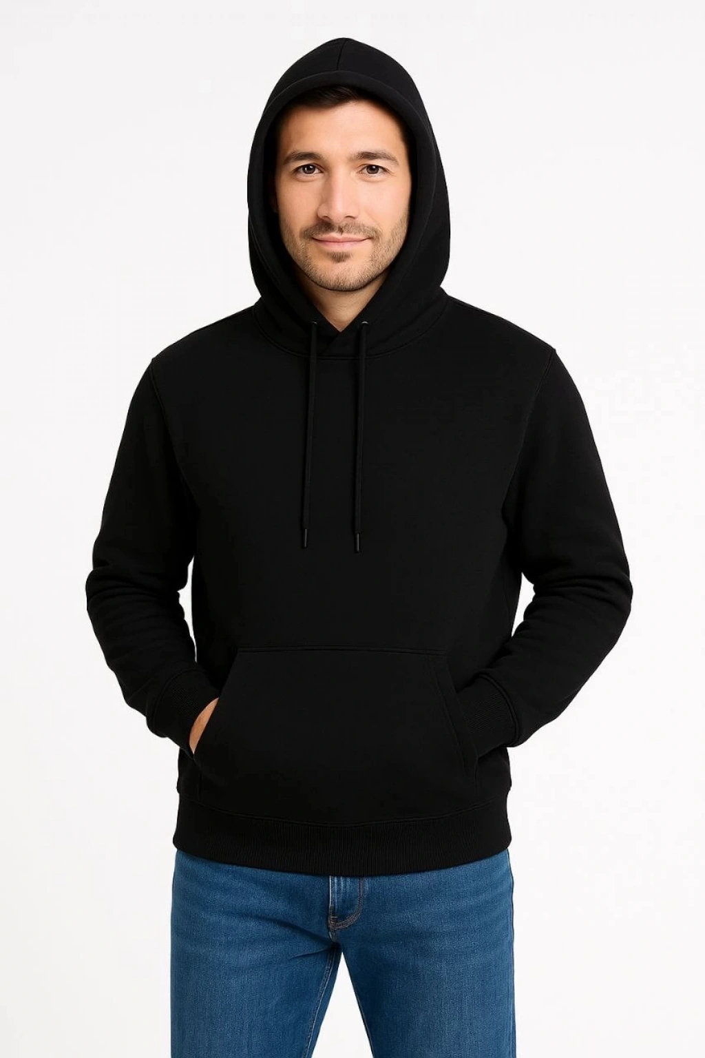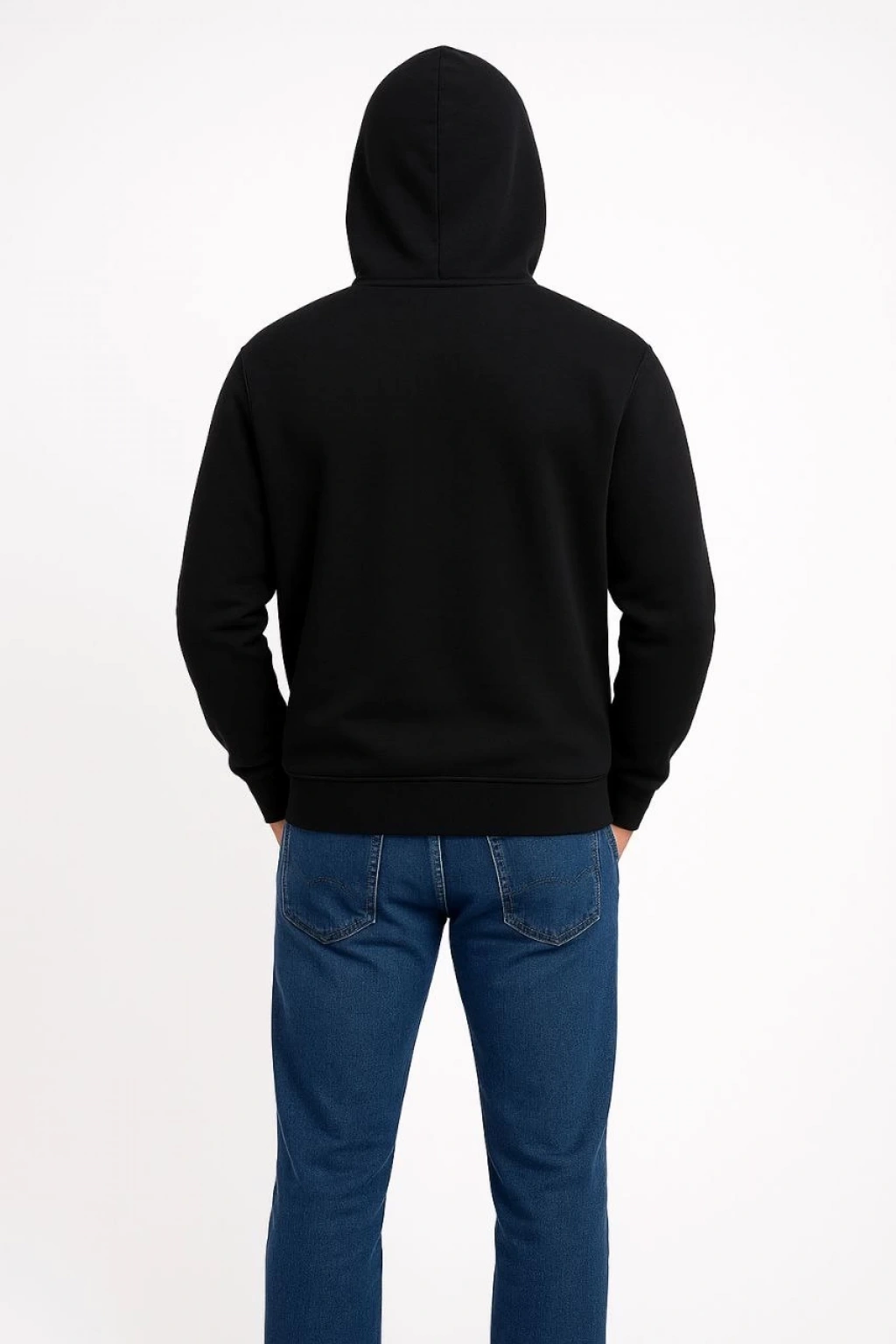 Erkek Oversize Üç İplik Kapüşonlu Sweatshirt – Siyah Sırt ve Ön Baskılı, Kanguru Cepli, Rahat Kalıp, İçi Pamuklu ModeL-Siyah