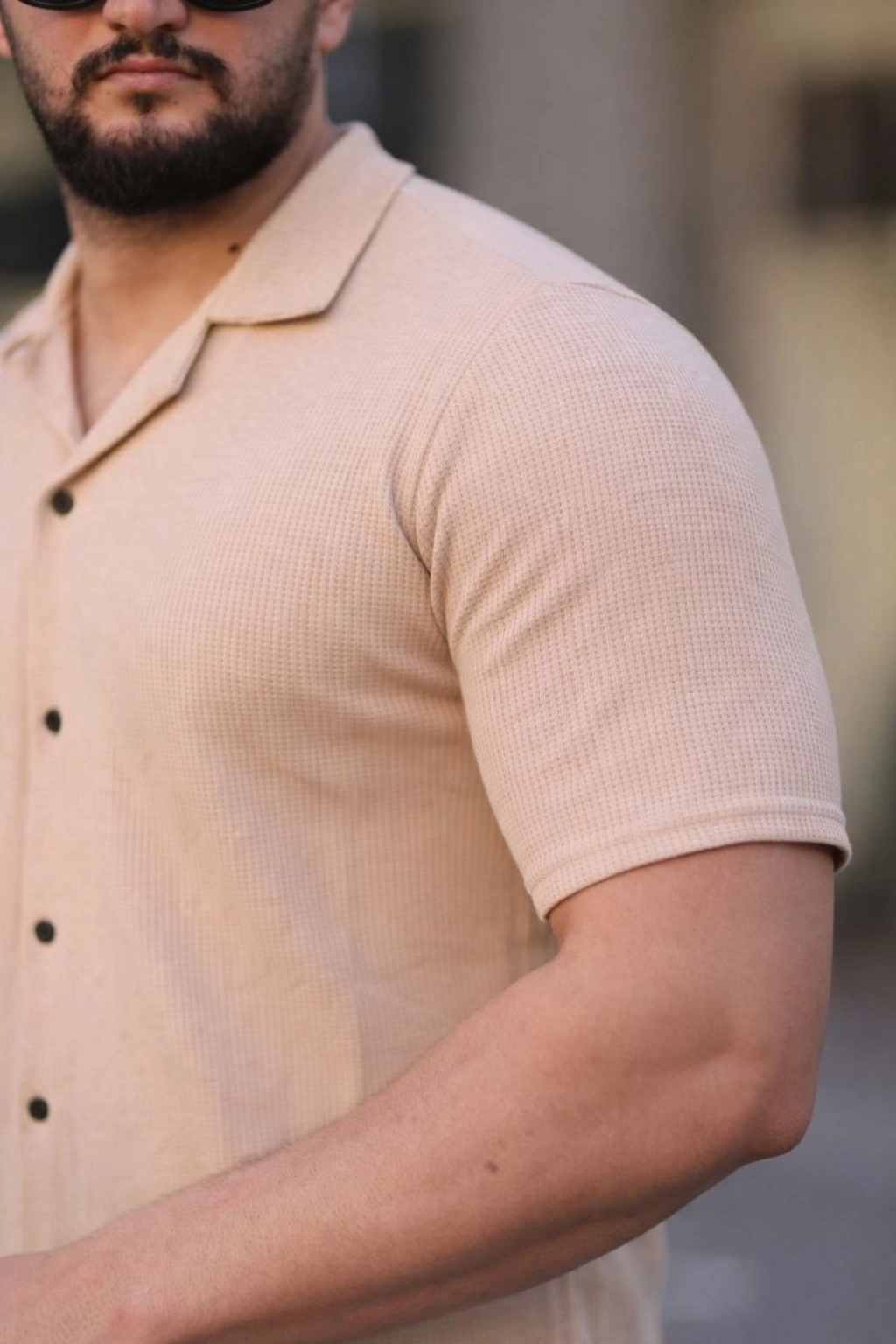 Erkek Waffle Kumaş Kısa Kollu Düğmeli Açık Yaka Regular Fit Gömlek - Bej