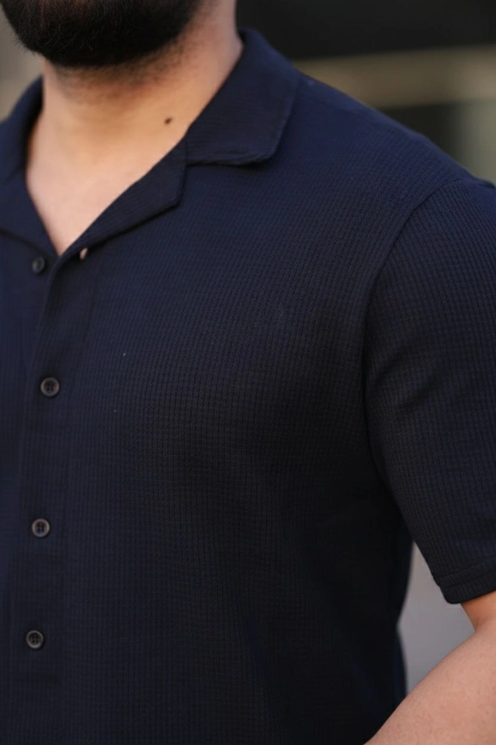 Erkek Waffle Kumaş Kısa Kollu Düğmeli Açık Yaka Regular Fit Gömlek - Lacivert