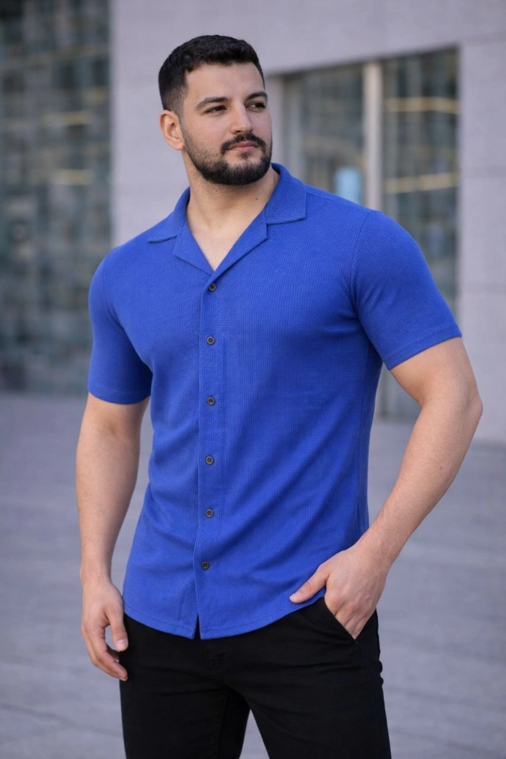 Erkek Waffle Kumaş Kısa Kollu Düğmeli Açık Yaka Regular Fit Gömlek - Lacivert