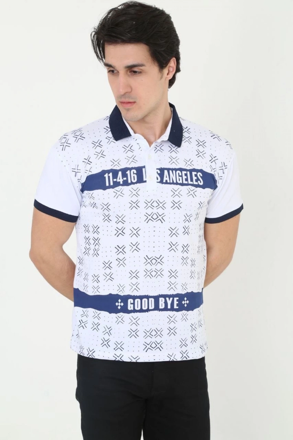 Erkek Yakalı Slim Fit Baskılı T-Shirt - Beyaz