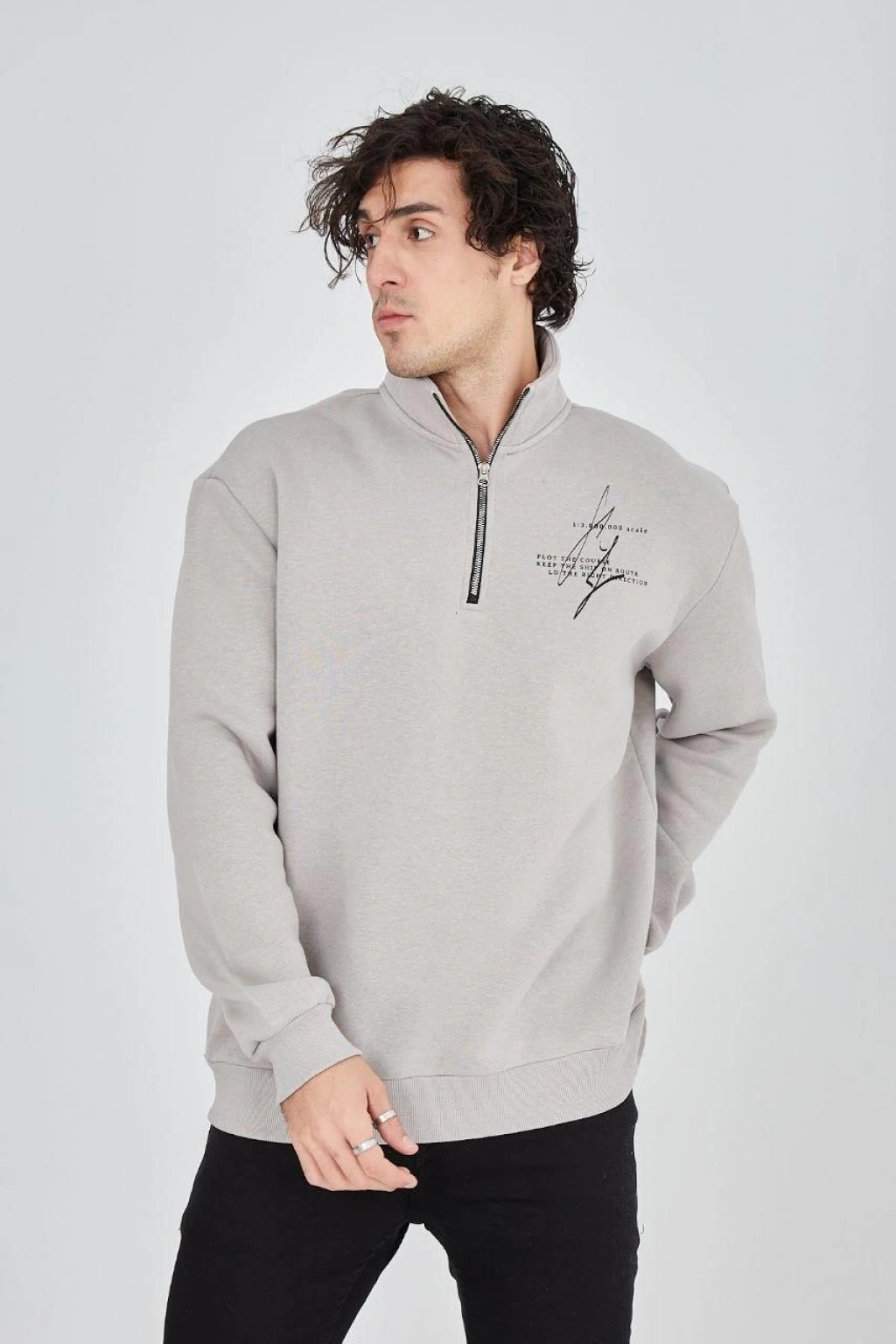 Erkek Dik Yaka Sweatshirt Dik Yaka Yarım Fermuarlı 3 İplik Şardonlu Pamuk Kumaş - Gri