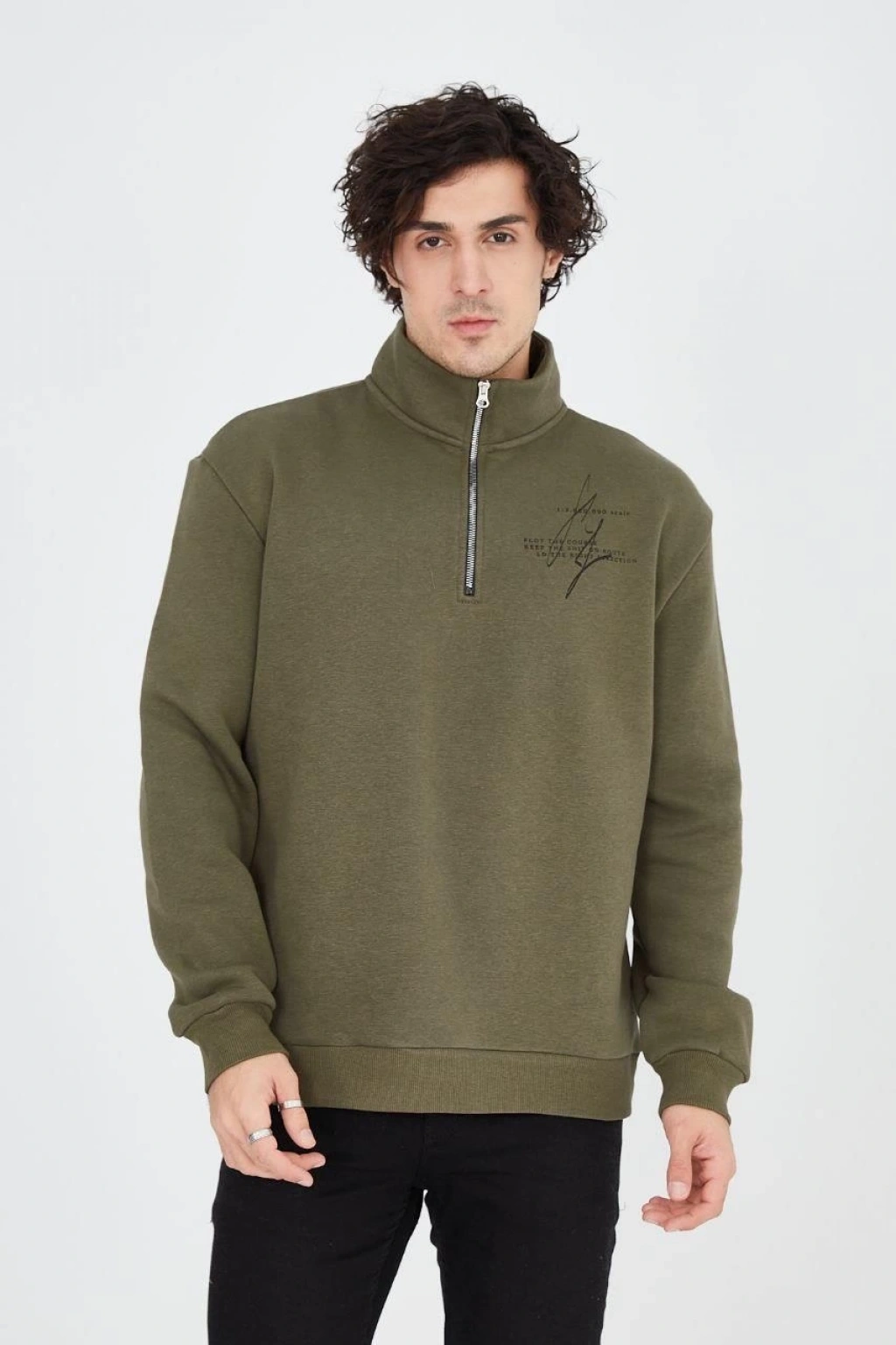 Erkek Patlı Yaka Üç İplik Pamuklu Sweatshirt Double Oversize Rahat Kalıp Günlük Kullanım – Bej