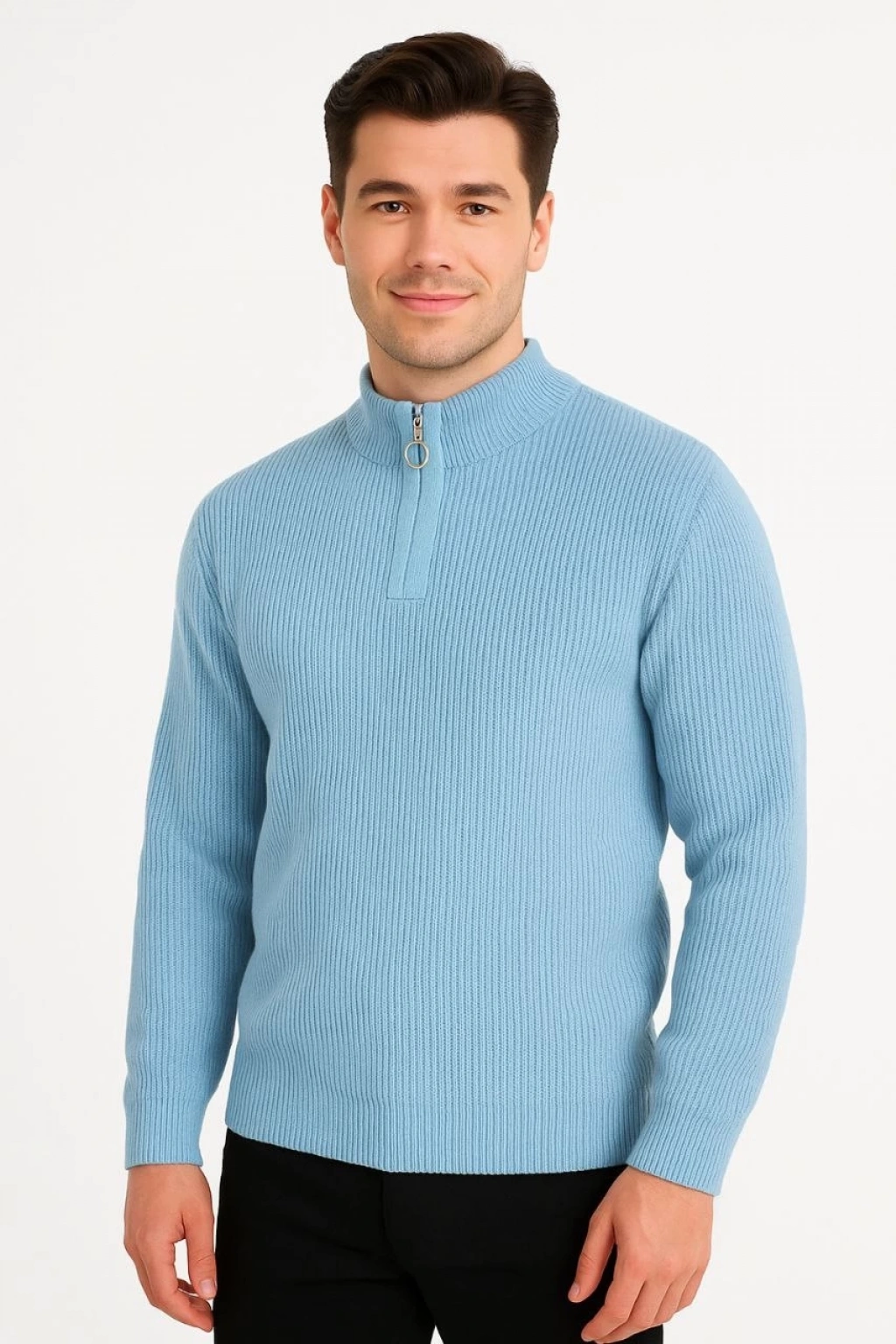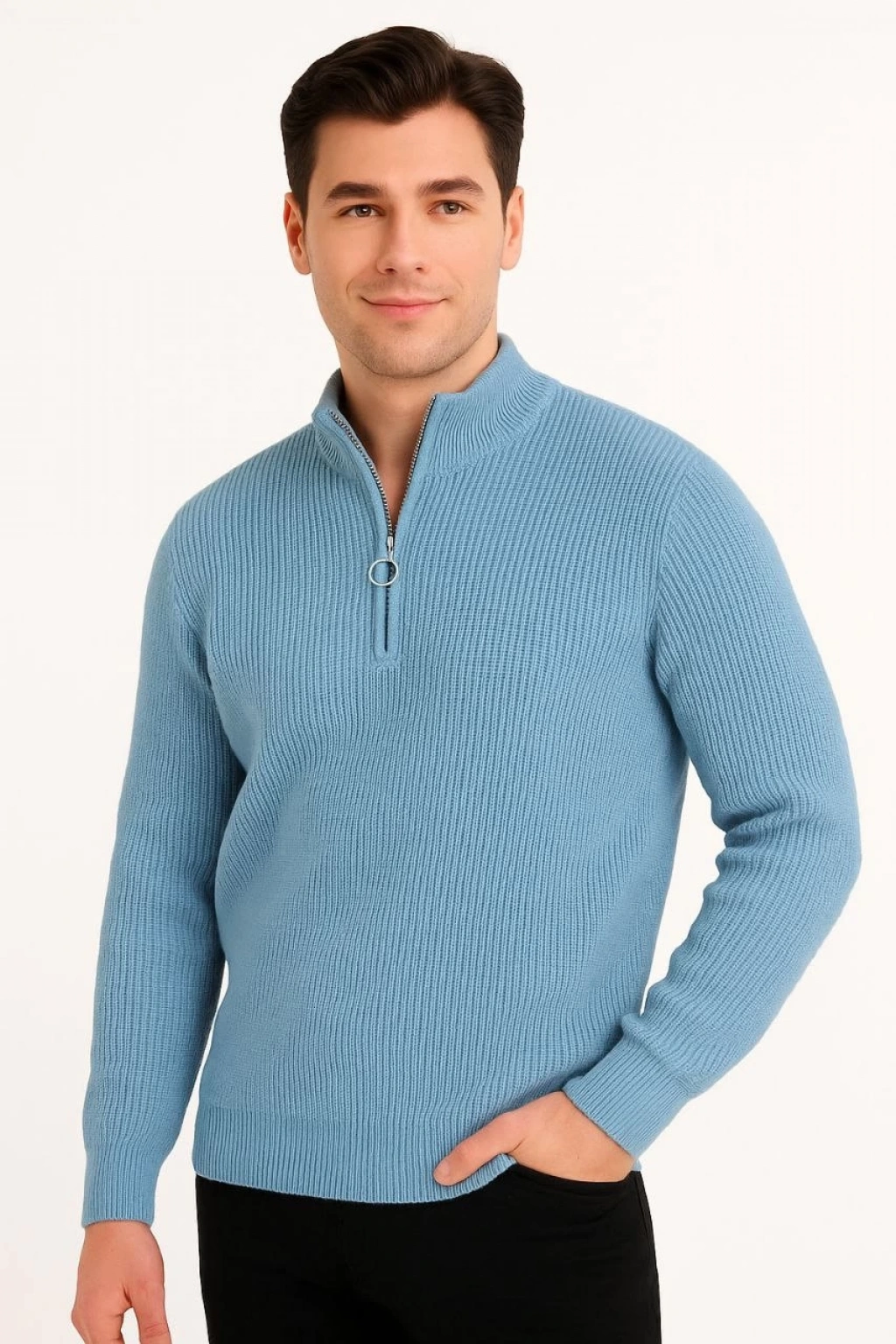 Erkek Yarım Fermuarlı Triko Kazak – Selanik Örgü, Dik Yaka, Pamuklu Dokuma, Regular Fit Uzun Kollu Kışlık Model - Mint Yeşili