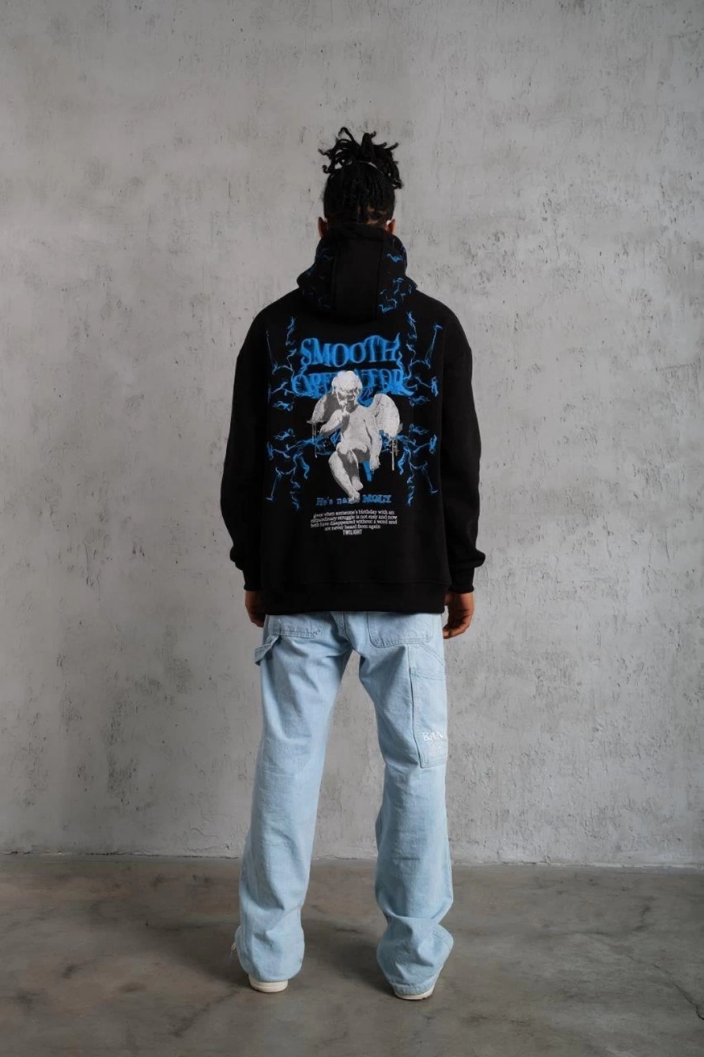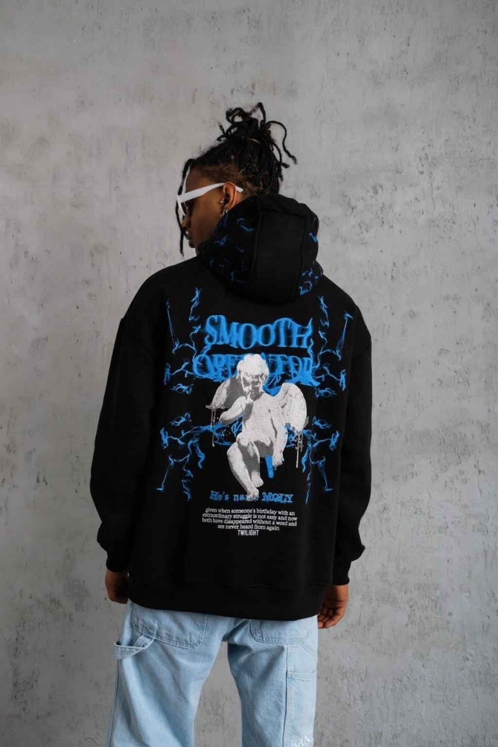 Erkek Oversize Üç İplik Kapüşonlu Sweat – Siyah Kol ve Etek Ribana Detaylı, Ön ve Sırt Baskılı, Kanguru Cepli Rahat Kalıp Model