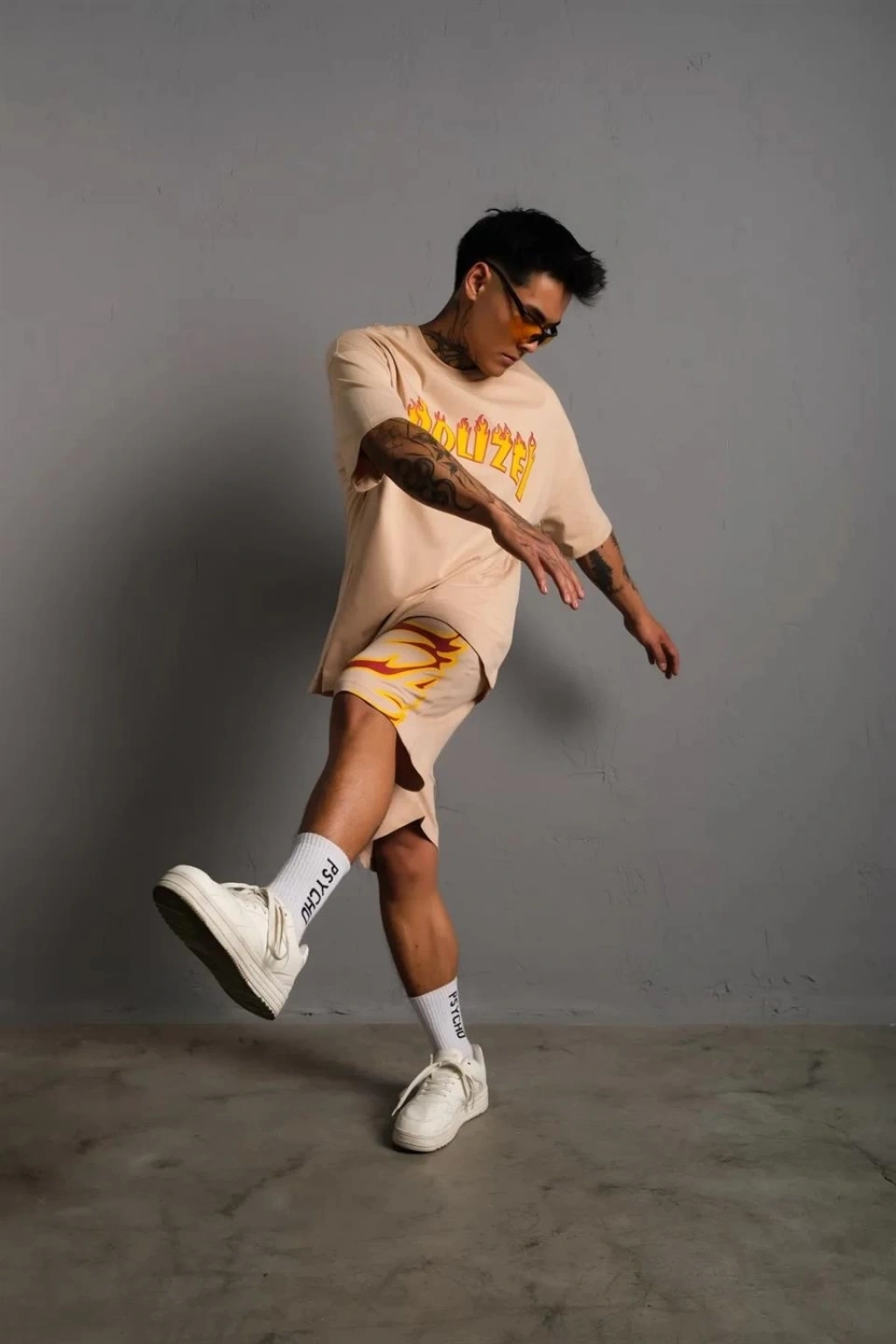 Erkek Alev Baskılı İkili Şortlu Takım - Bej