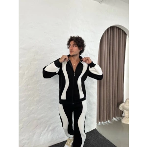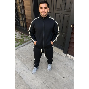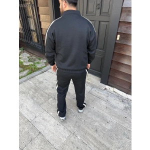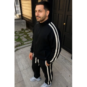 ERKEK ÇİFT ŞERİTLİ EŞOFMAN TAKIM DİK YAKA FERMUARLI SWEATSHİRT BORU PAÇA ALT, OVERSİZE 3 İPLİK PAMUKLU - SİYAH