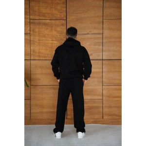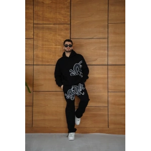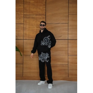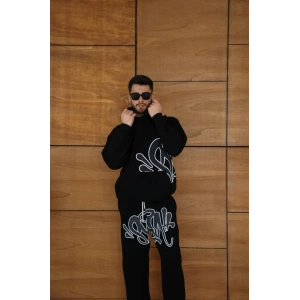 ERKEK KAPÜŞONLU EŞOFMAN TAKIM GRAFFİTİ BASKILI OVERSİZE RAHAT KALIP, KANGURU CEPLİ, STREETWEAR TARZINDA PREMİUM ÜRÜN 3 İPLİK PAMUKLU - SİYAH