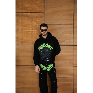 ERKEK KAPÜŞONLU EŞOFMAN TAKIM ÖRÜMCEK AĞI VE NEON YEŞİL BASKILI KANGURU CEPLİ OVERSİZE RAHAT KALIP, PREMİUM ÜÇ İPLİK KUMAŞ - SİYAH