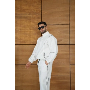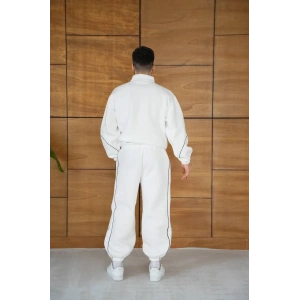 ERKEK PREMİUM PARÇALI EŞOFMAN TAKIM - DİK YAKA FERMUARLI BİYELİ SWEATSHİRT LASTİK PAÇA ALT, OVERSİZE 3 İPLİK ŞARDONLU - BEYAZ