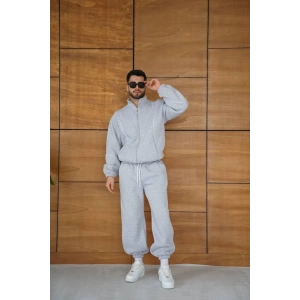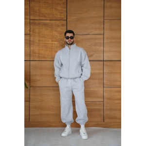 ERKEK PREMİUM PARÇALI EŞOFMAN TAKIM - DİK YAKA FERMUARLI BİYELİ SWEATSHİRT LASTİK PAÇA ALT, OVERSİZE 3 İPLİK ŞARDONLU - GRİ