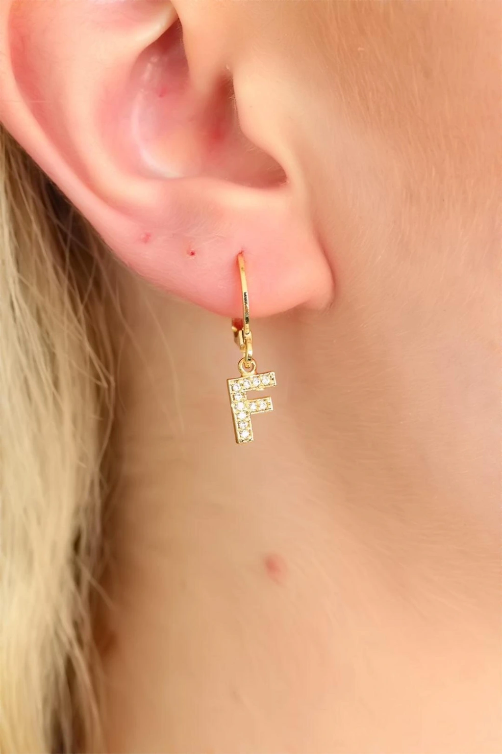 Gold Renk Zirkon Taşlı F Harf Bayan Küpe