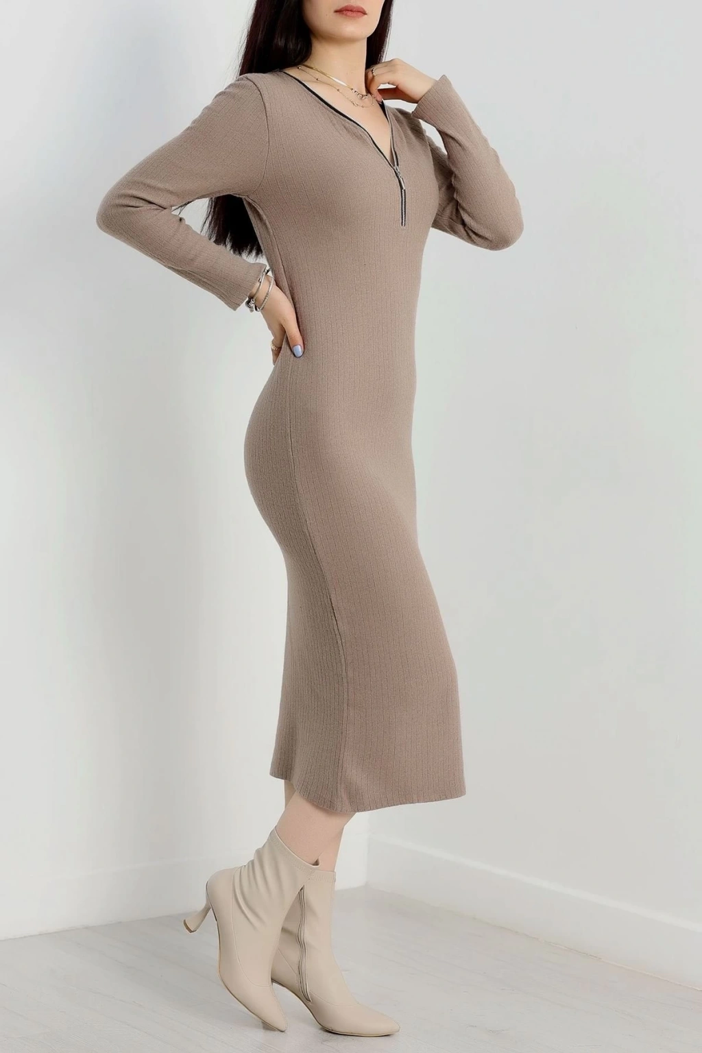 Fermuar detaylı fitilli şardonlu elbise siyah a3178