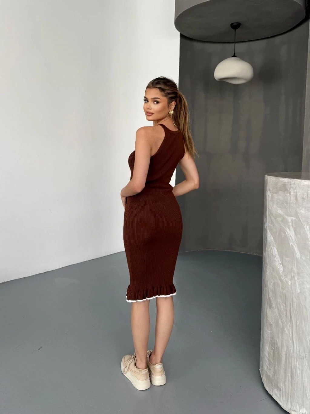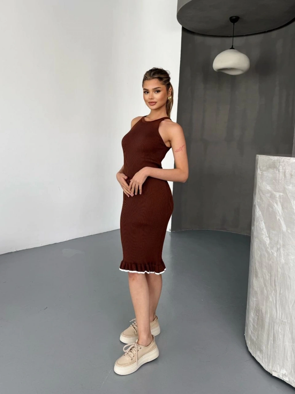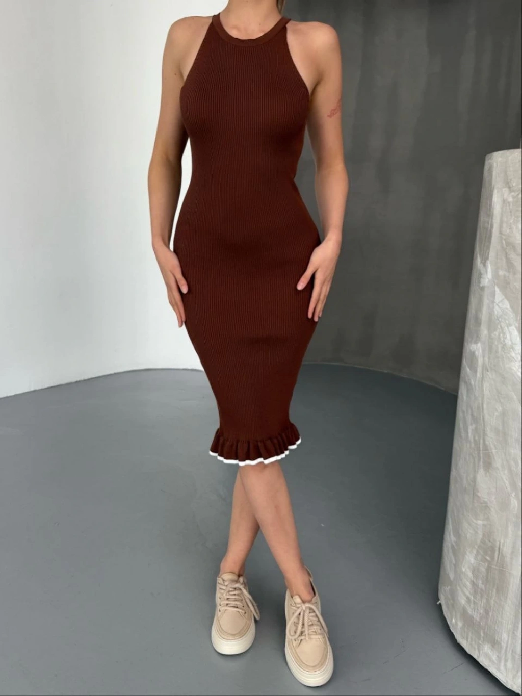 Kadın Boğazlı Uzun Fitilli Triko Dokuma Elbise - Kahverengi