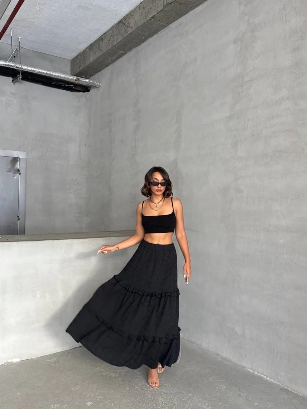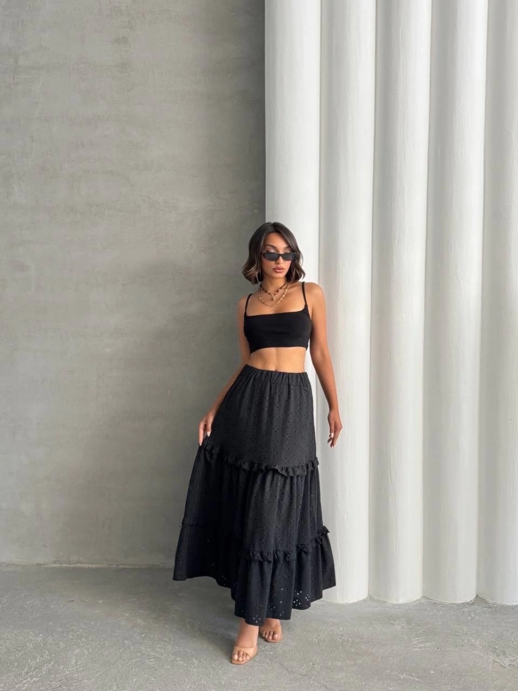 Şıklık ve tarzı bir arada sunan fırfırlı brodeli astarlı uzun etek, gardırobunuzun vazgeçilmez parçalarından olmaya aday.
