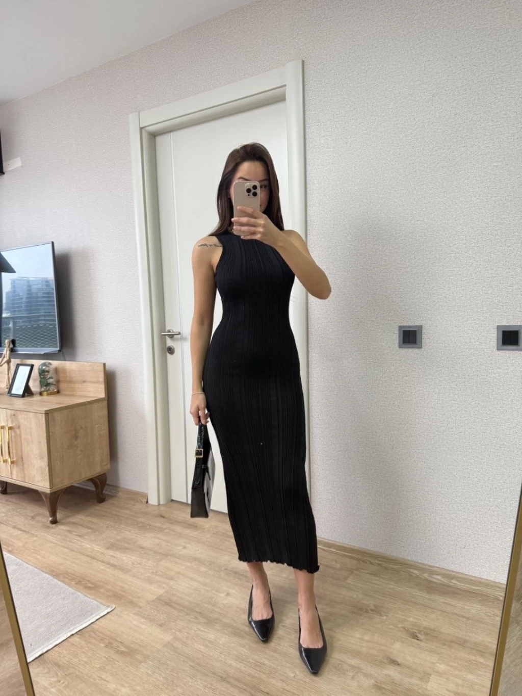 Kadın Boğazlı Triko Elbise – Uzun Fitilli Esnek Dokuma, Tam Kalıp, Kışlık & Baharlık Şık Rahat Stil, 130 cm Midi Boy Elbise - Siyah