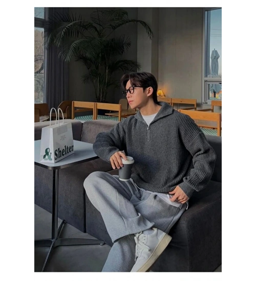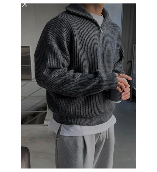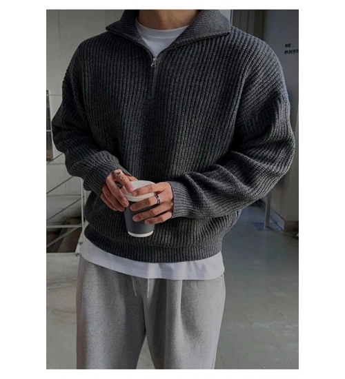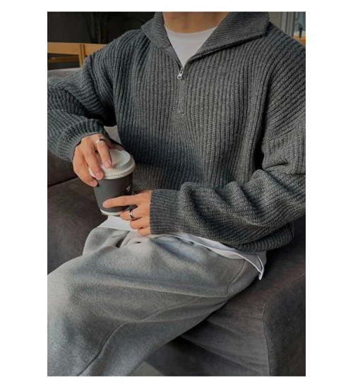 Antrasit Erkek Oversize Fermuarlı Balıkçı Triko Kazak