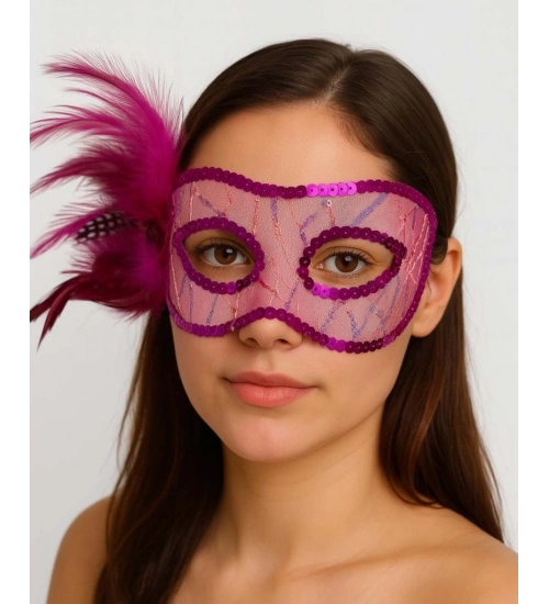 Fuşya Renk Yandan Tüylü Pul Payet İşlemeli Parti Maskesi 23x12 cm