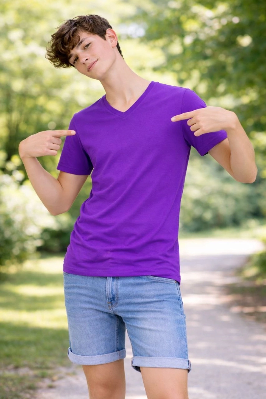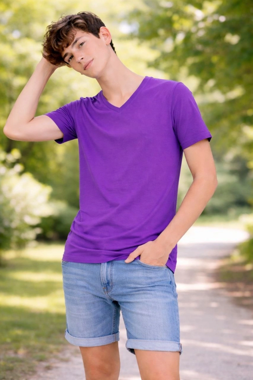 Genç Erkek Çocuk V Yaka Tişört Yazlık Model Günlük Basic Body - Nar Çiçeği
