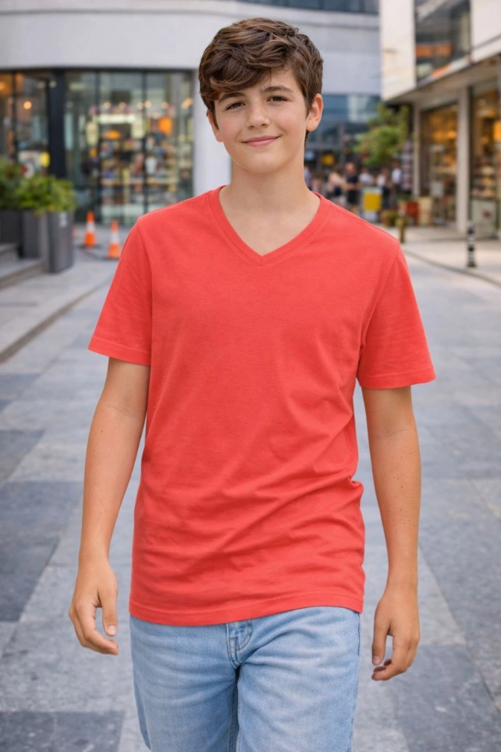 Genç Erkek Çocuk V Yaka Tişört Yazlık Model Günlük Basic Body - Pembe