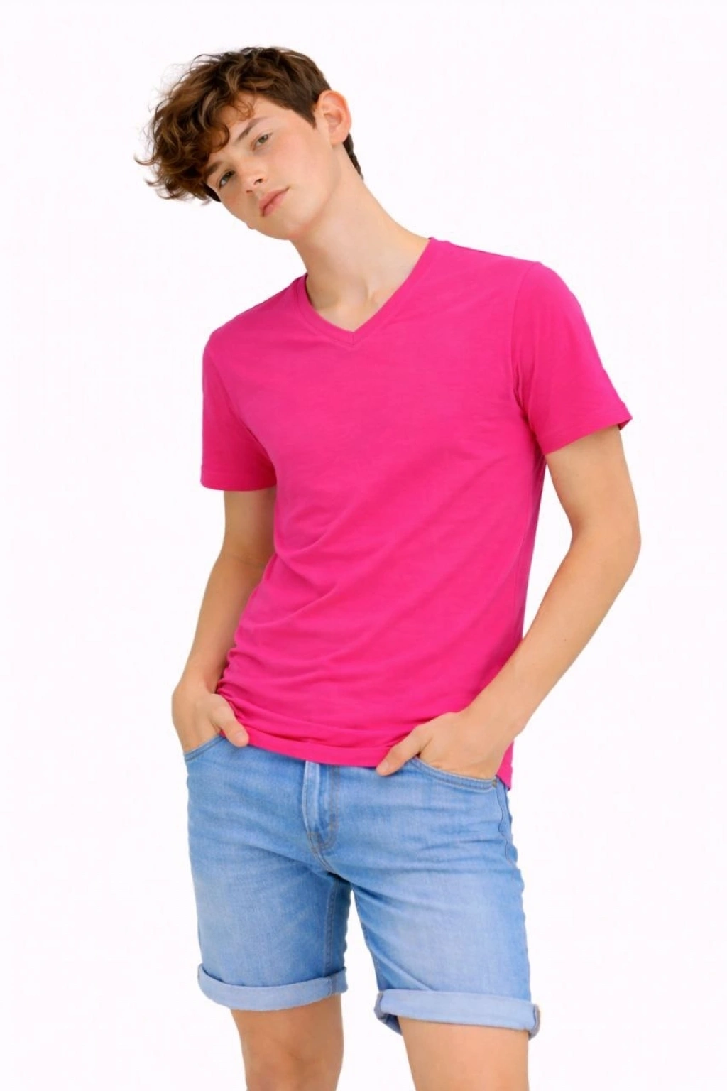 Genç Erkek Çocuk V Yaka Tişört Yazlık Model Günlük Basic Body - Nar Çiçeği