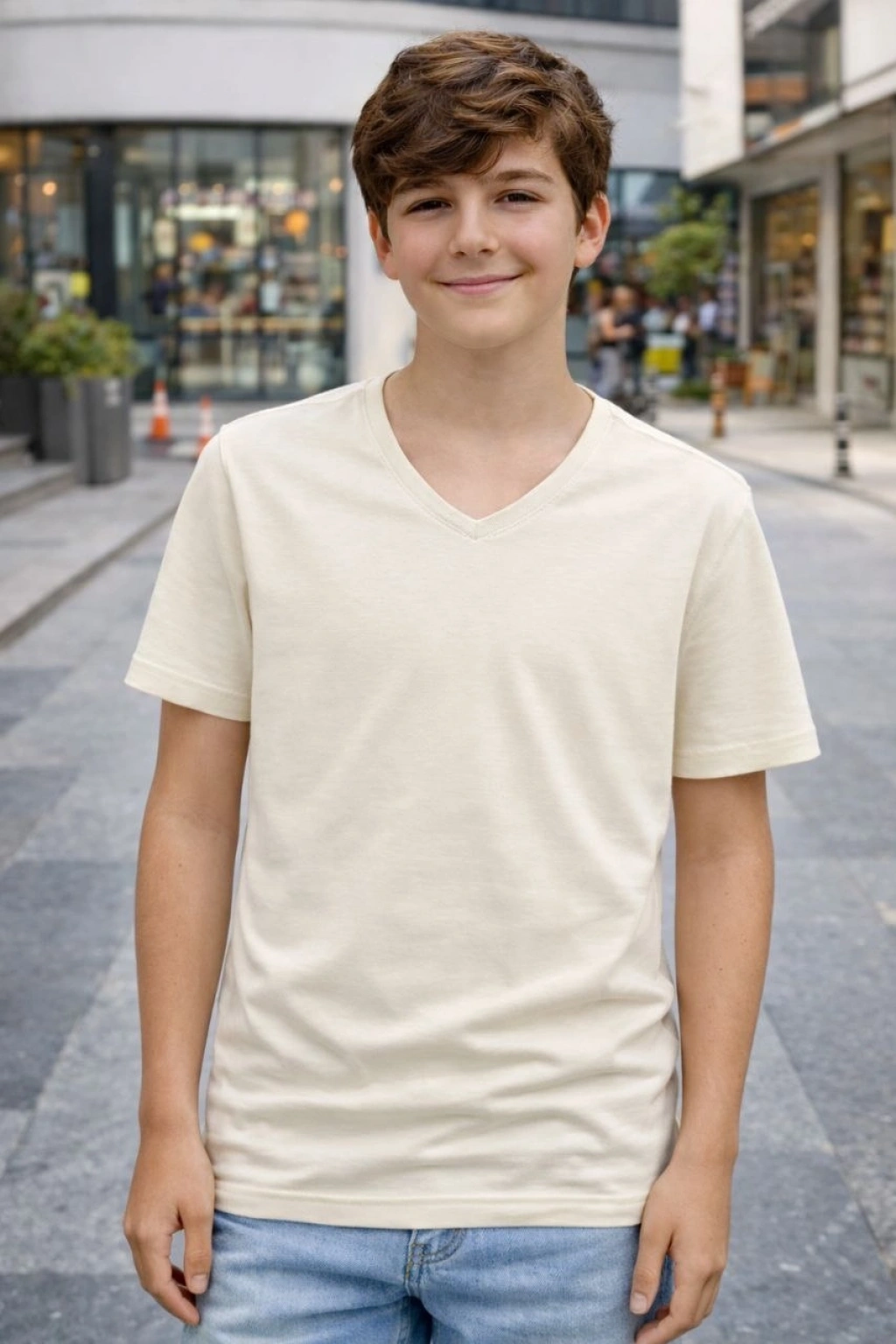 Genç Erkek Çocuk V Yaka Tişört Yazlık Model Günlük Basic Body - Nar Çiçeği