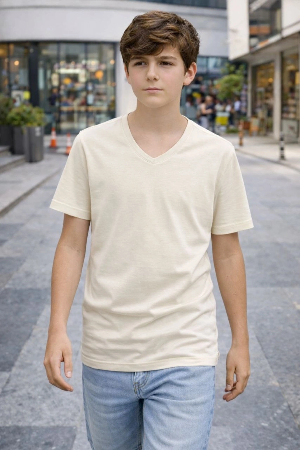 Genç Erkek Çocuk V Yaka Tişört Yazlık Model Günlük Basic Body - Sarı