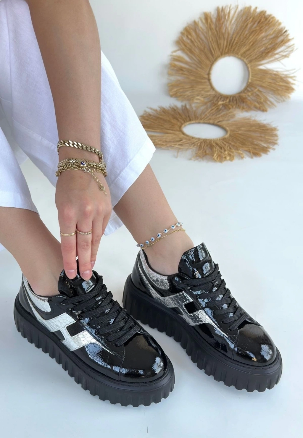 Gesti Siyah Rugan Gümüş Detaylı Bağcıklı Spor Ayakkabı