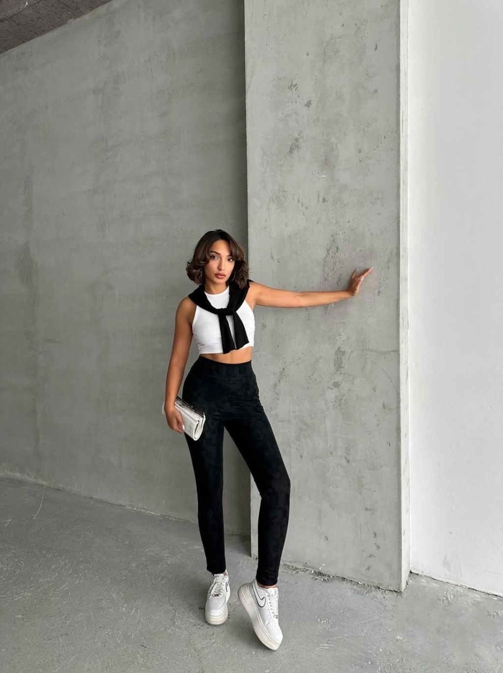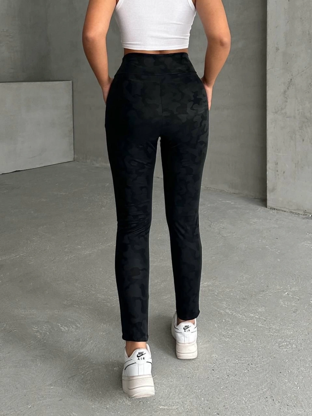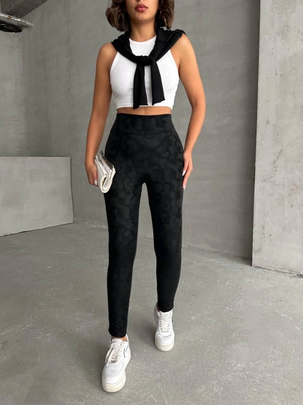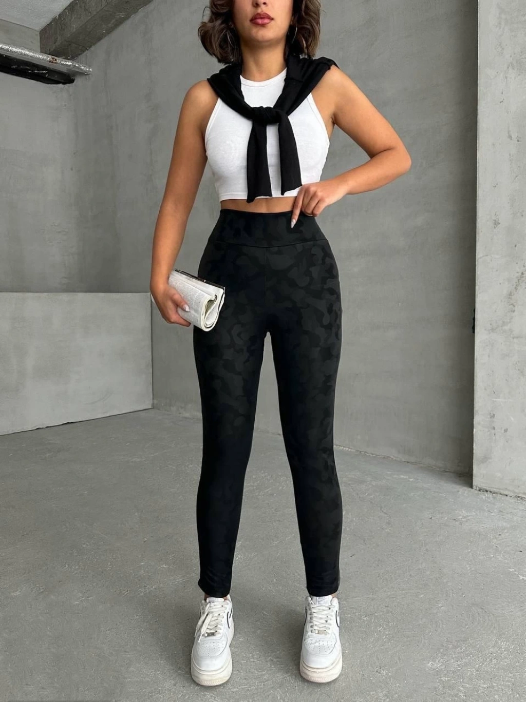 Trendleri takip eden kadınların favorisi olmaya aday, gizli yan fermuarlı bulut desenli siyah tayt ile şıklığı ve rahatlığı bir arada yaşayacaksınız.