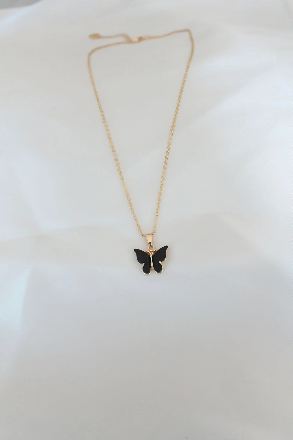Gold Kaplama Siyah Renkli Sedefli Kelebek Kolye