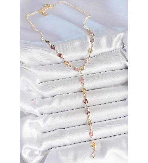 Gold Karışık Renk Zirkon Taşlı Y Pirinç Kolye