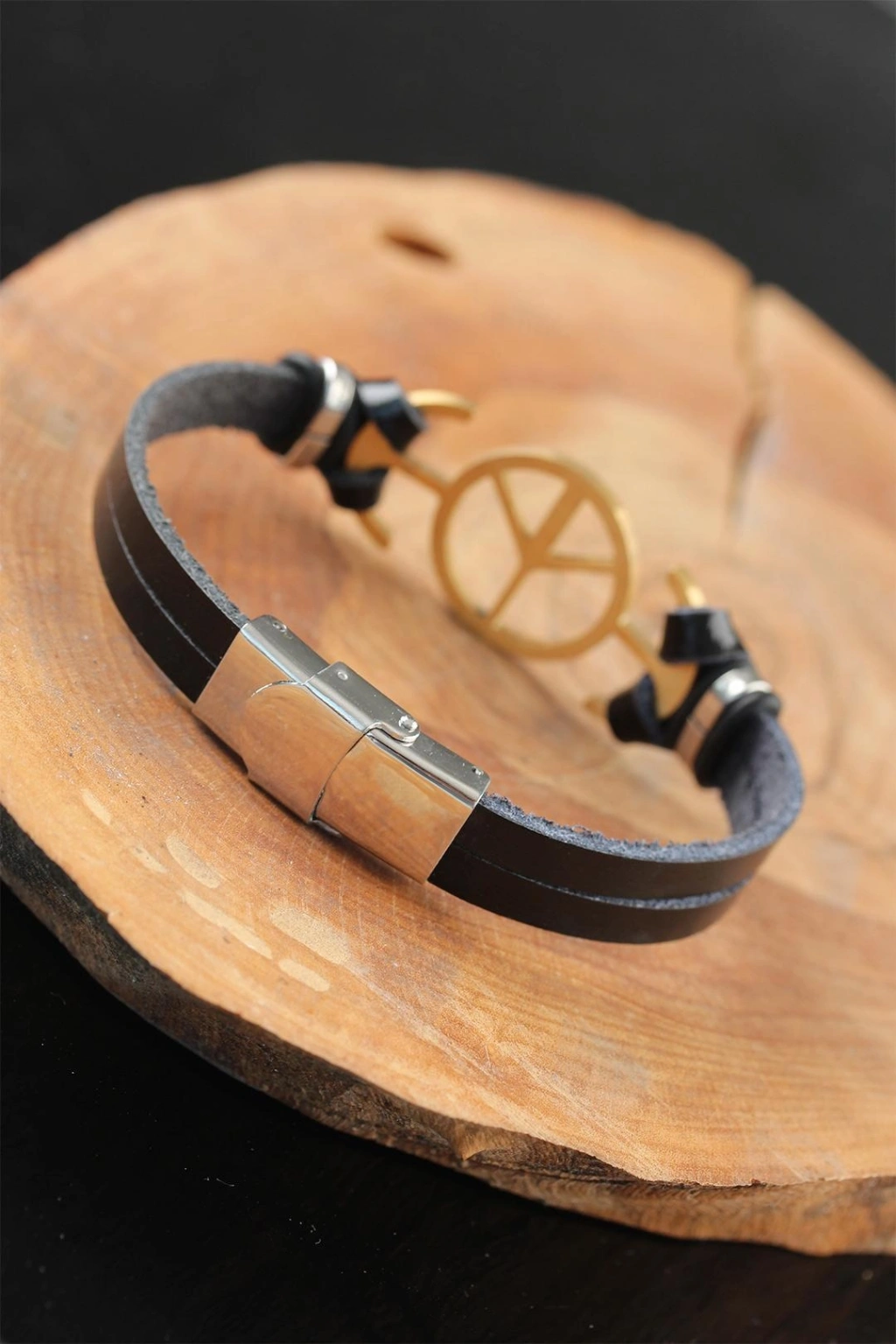 Kombinlerinizi Gold Renk Barış Figürlü Metal Aksesuarlı Siyah Renk Deri Erkek Bileklik ile şıklığa ulaştırın.