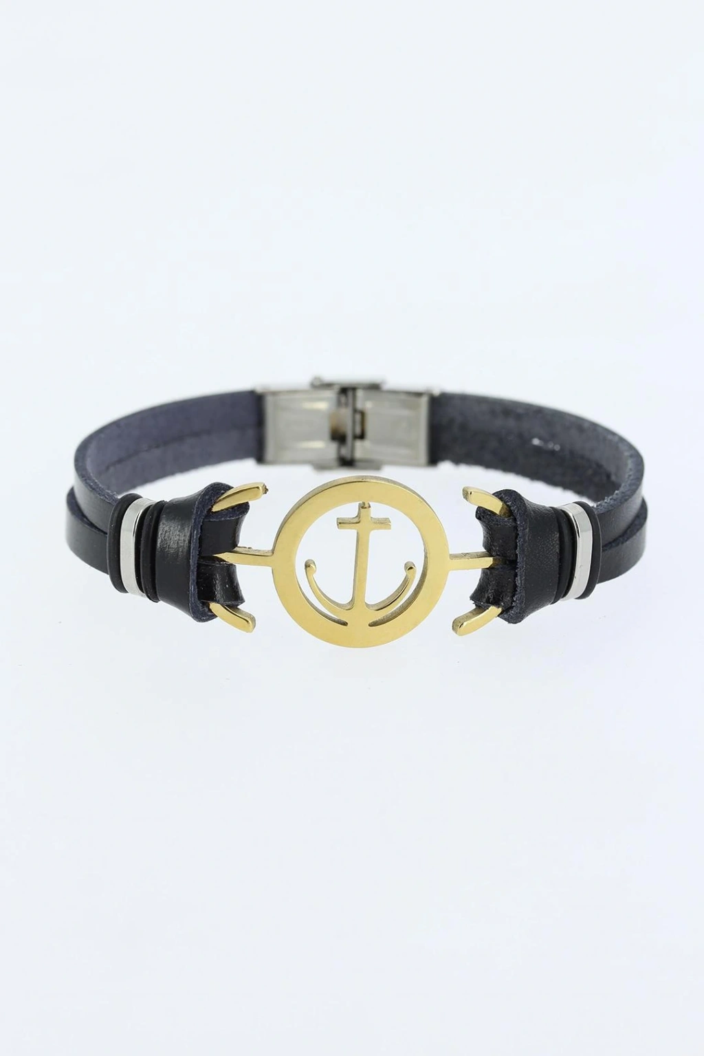 Gold Renk Deniz Çapası Figürlü Metal Aksesuarlı Siyah Renk Deri Erkek Bileklik