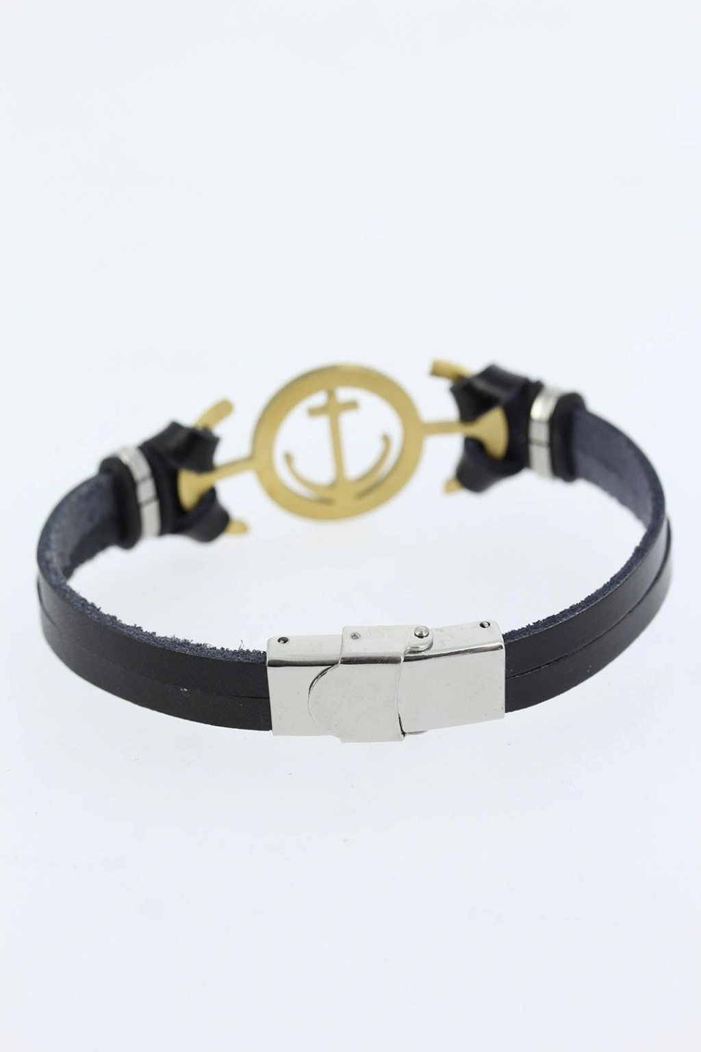 Gold Renk Deniz Çapası Figürlü Metal Aksesuarlı Siyah Renk Deri Erkek Bileklik