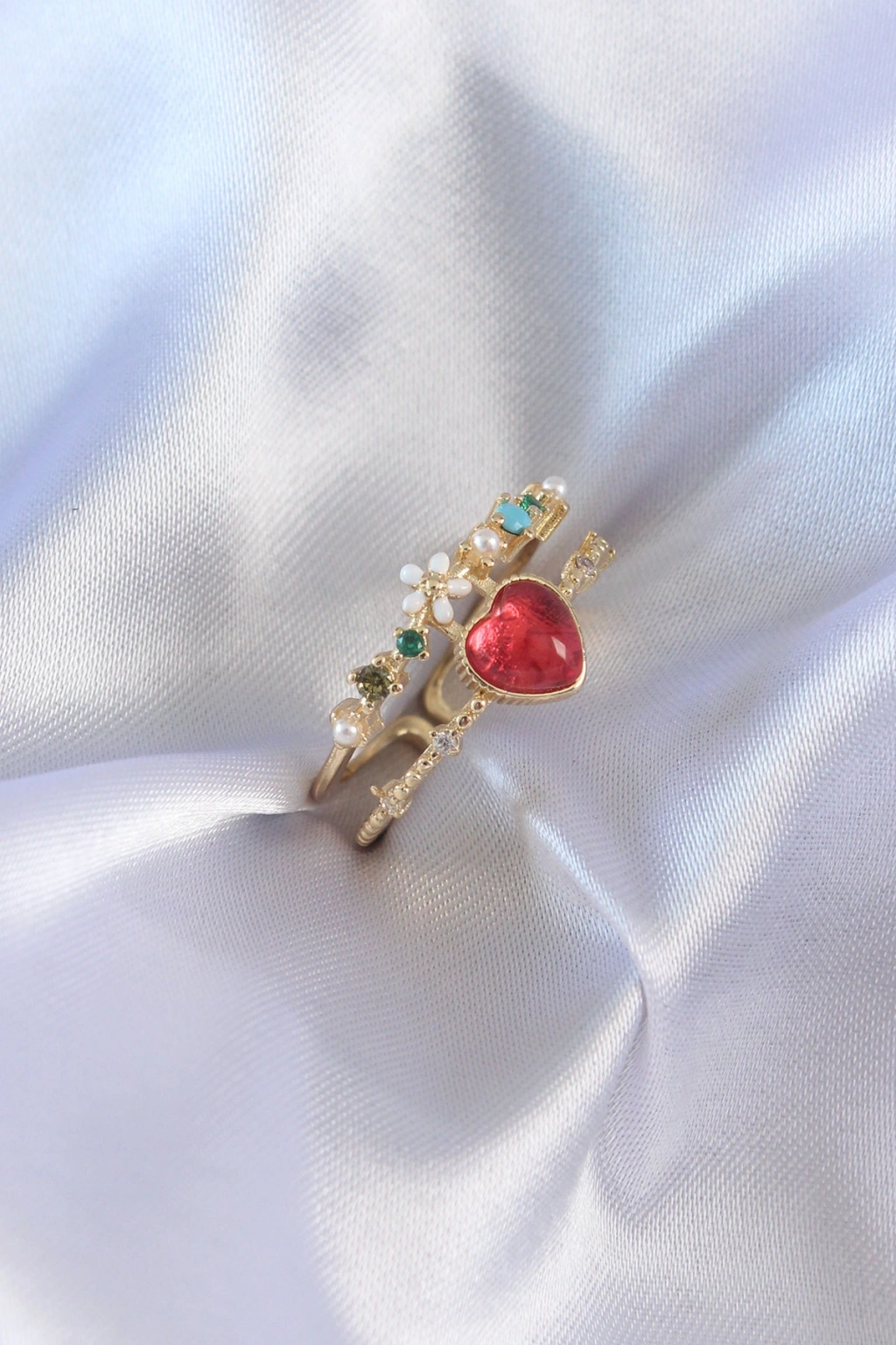 Gold Renk Kırmızı Zirkon Taş Kalp Model Pirinç Kadın Yüzük