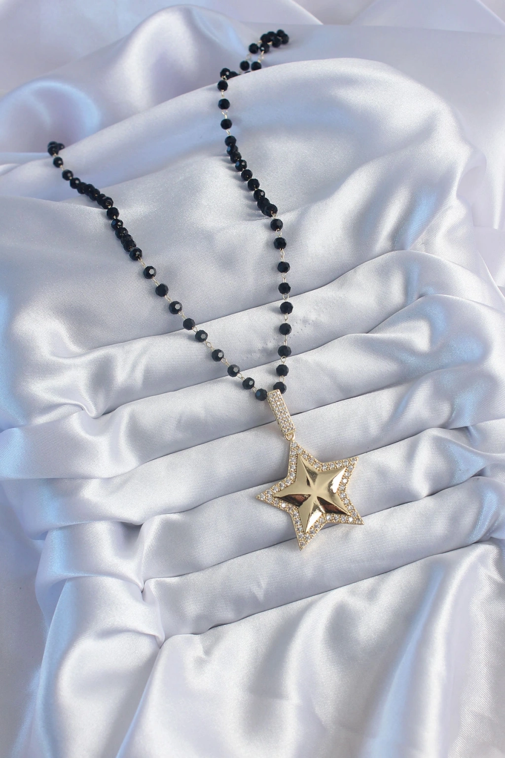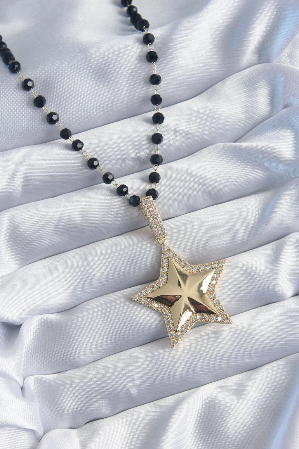 Gold Renk Siyah Boncuk Zirkon Taşlı Yıldız Model Vip Seri Kadın Kolye