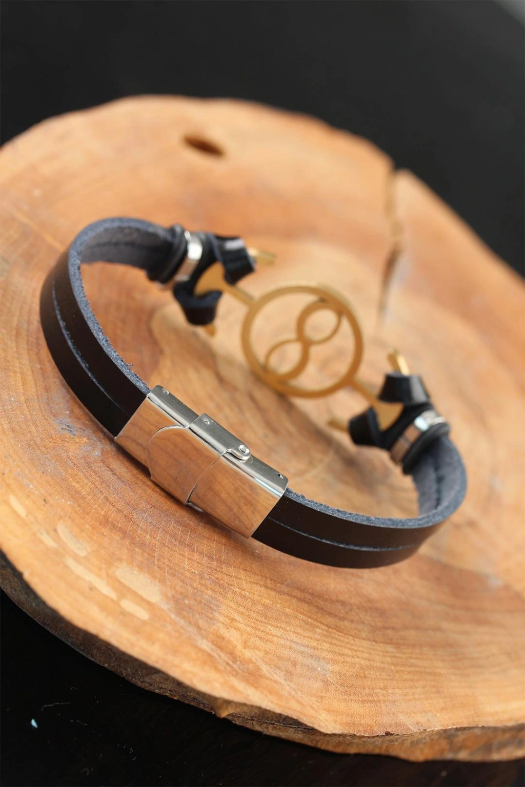 Gold Renk Sonsuzluklu Metal Aksesuarlı Siyah Renk Deri Erkek Bileklik