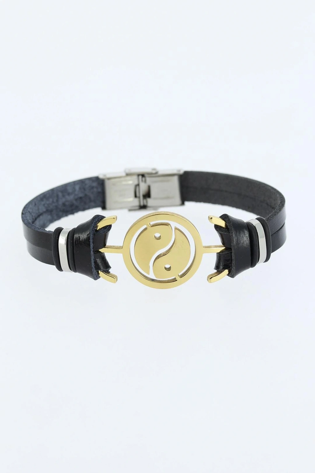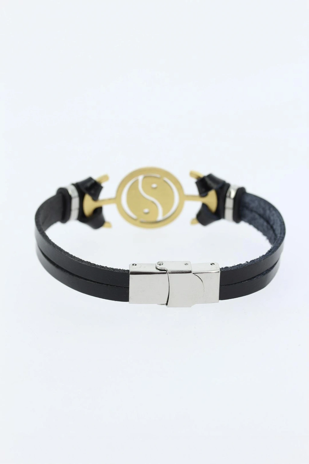 Gold Renk Yin Yang Figürlü Metal Aksesuarlı Siyah Renk Deri Erkek Bileklik