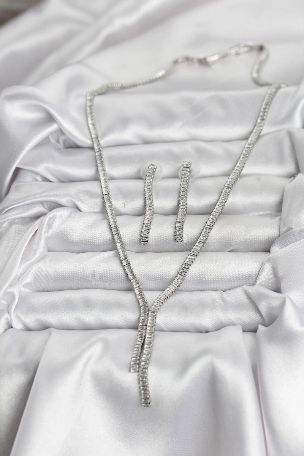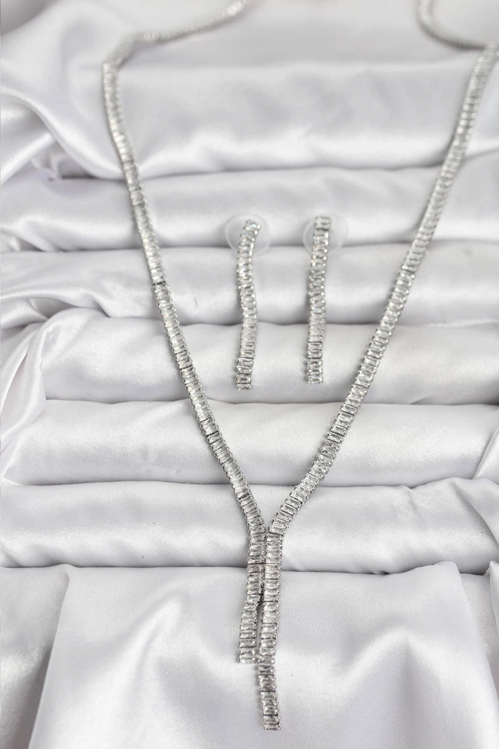 Gümüş Renk Baget Zirkon Taşlı Kadın Kolye Küpe Set