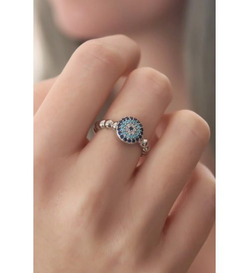 Gümüş Renk Nazar Boncuk Figür Zirkon Taş Detay Kadın Yüzük
