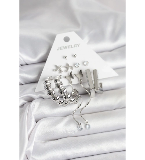 Gümüş Renk Pirinç 6'lı Kadın Küpe Seti