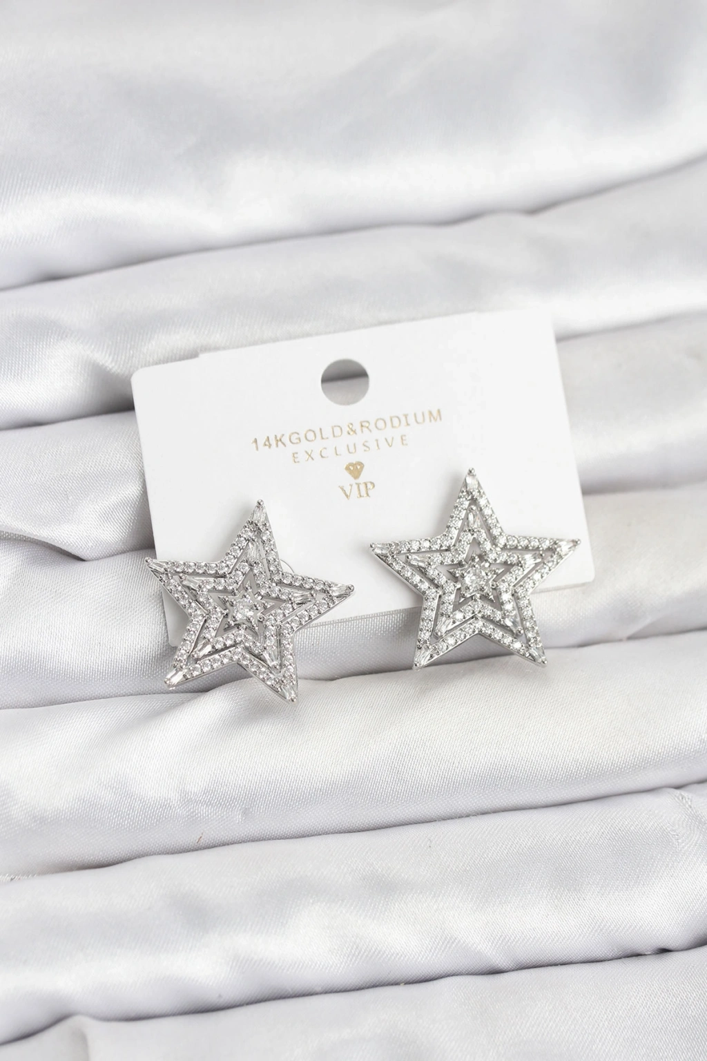 Gümüş Renk Pirinç Zirkon Taşlı Yıldız Model Kadın Küpe