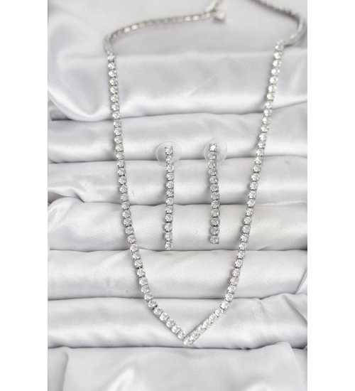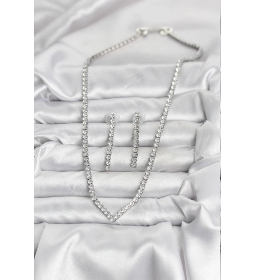 Gümüş Renk Zirkon Taşlı Kadın Kolye Küpe Seti