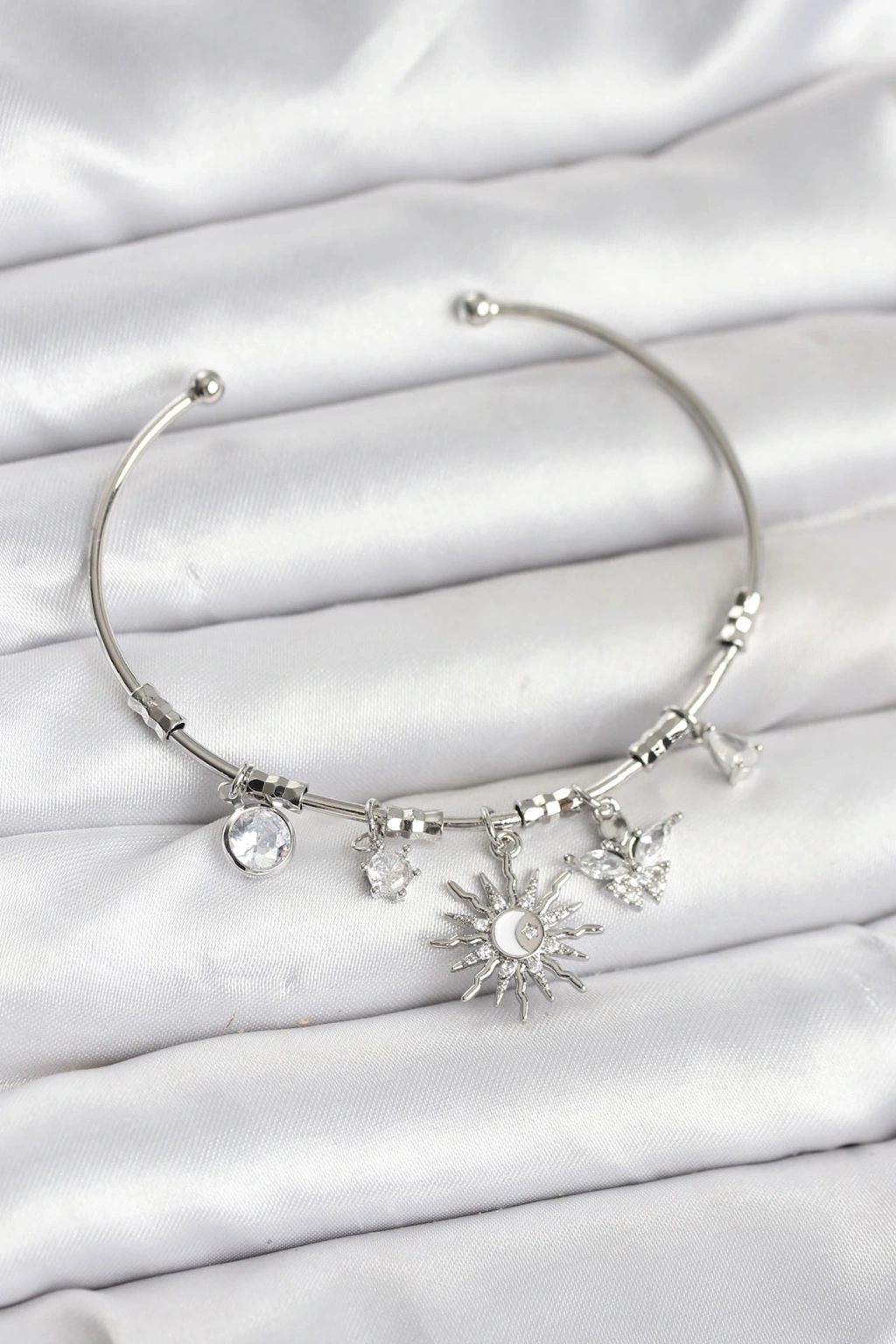 Güneş Charmlı Gümüş Renk Pirinç Kadın Bileklik